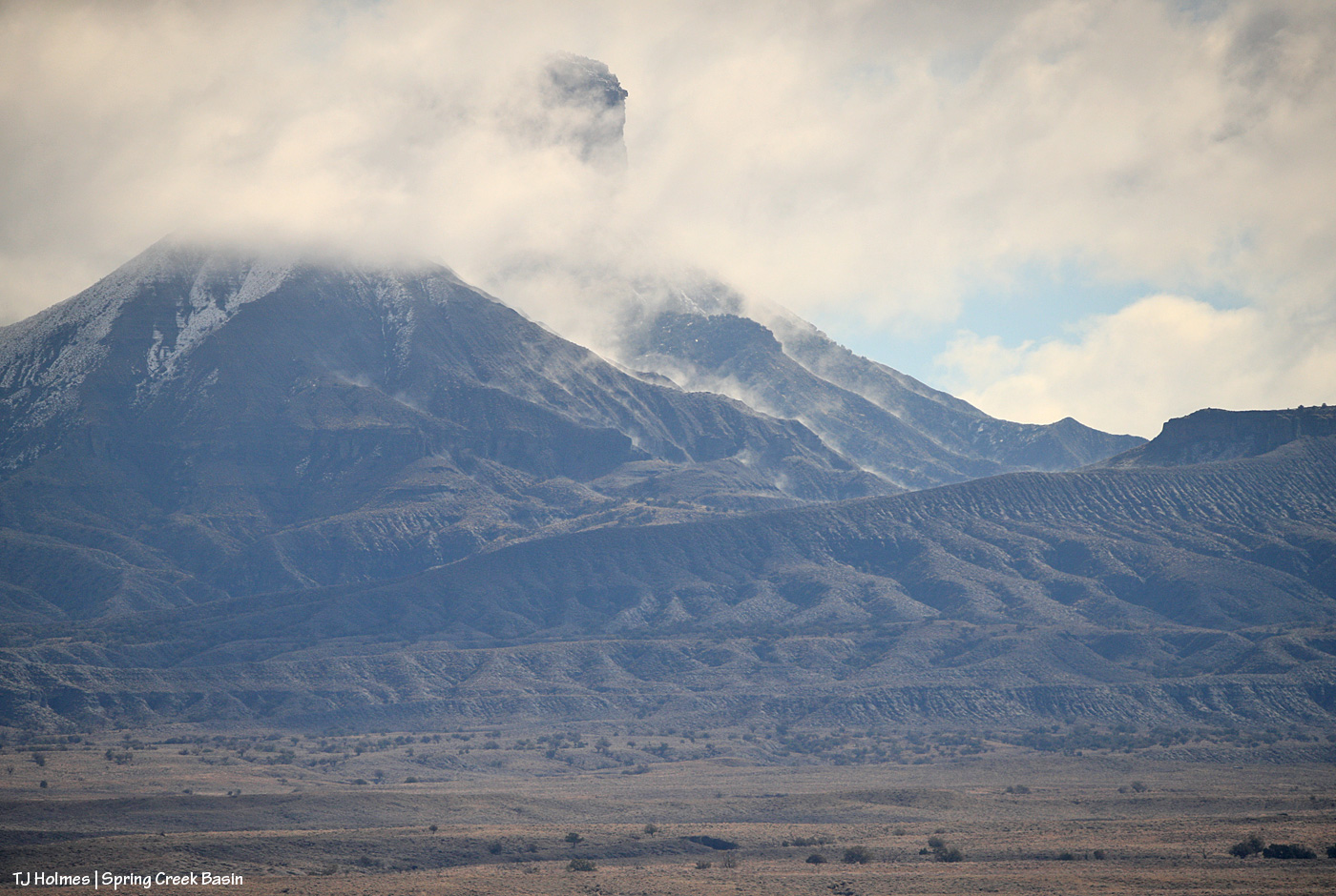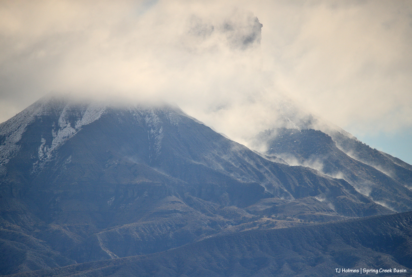 Valentine’s Day morning: Clouds clearing from the peak of McKenna and the upper butte of Temple. The snow on the left/north-facing side of McKenna Peak is fresh (and no longer there after the clouds cleared to reveal a completely clear Colorado sky).