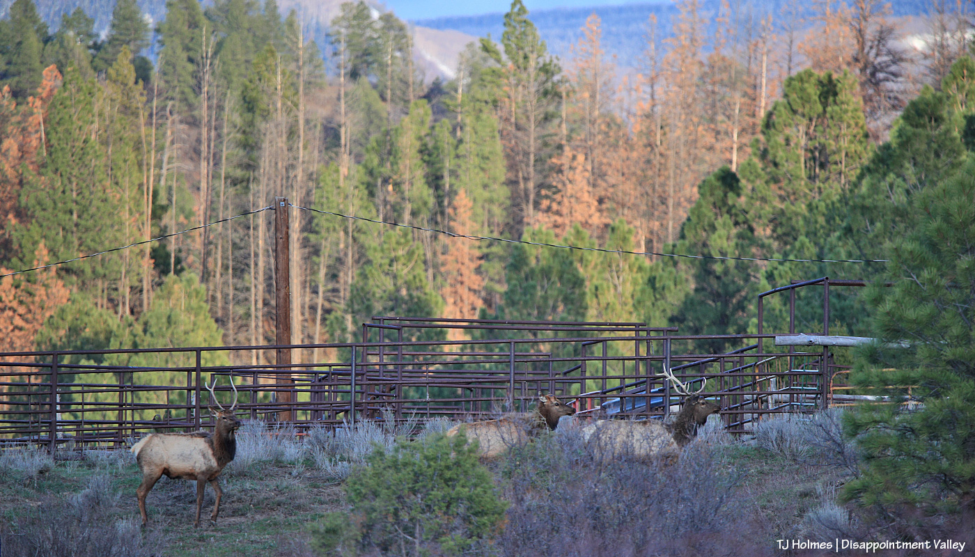 Not much farther, I stopped in the middle of the road and shot over the hood to try to catch these two young bull elk and a cow as they raced across the road and into the trees near some cattle pens belonging to up-valley neighbors. Note the “orange” pines in the background. Not even in Southwest Colorado are we escaping the deaths of ponderosas (and other conifers) across Colorado and the West because of drought and insects.