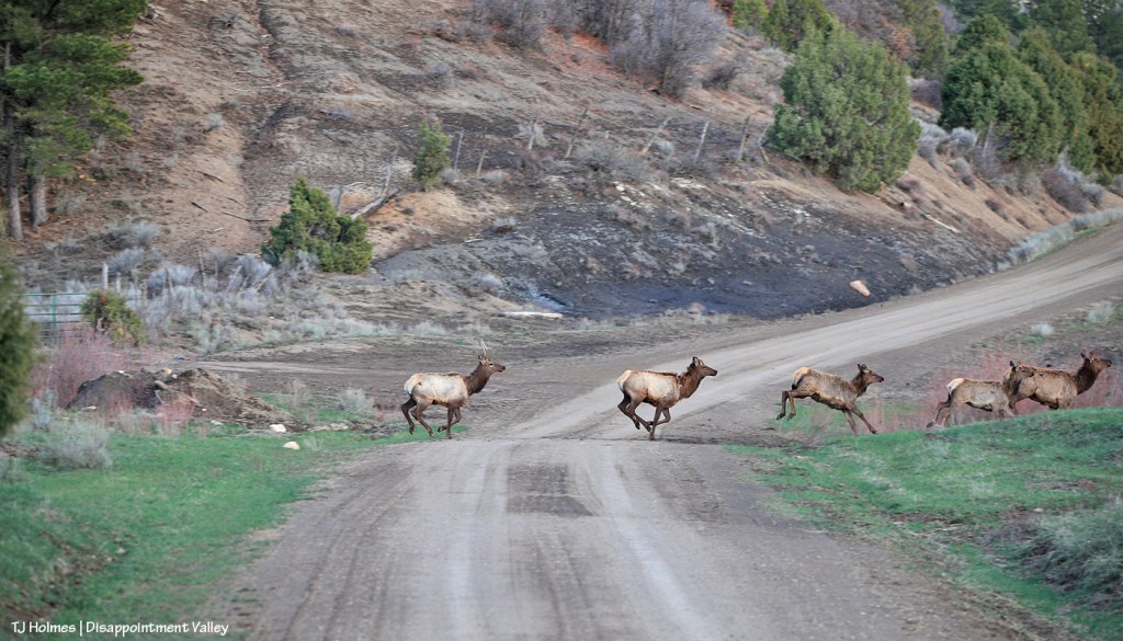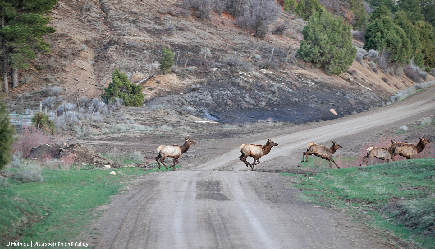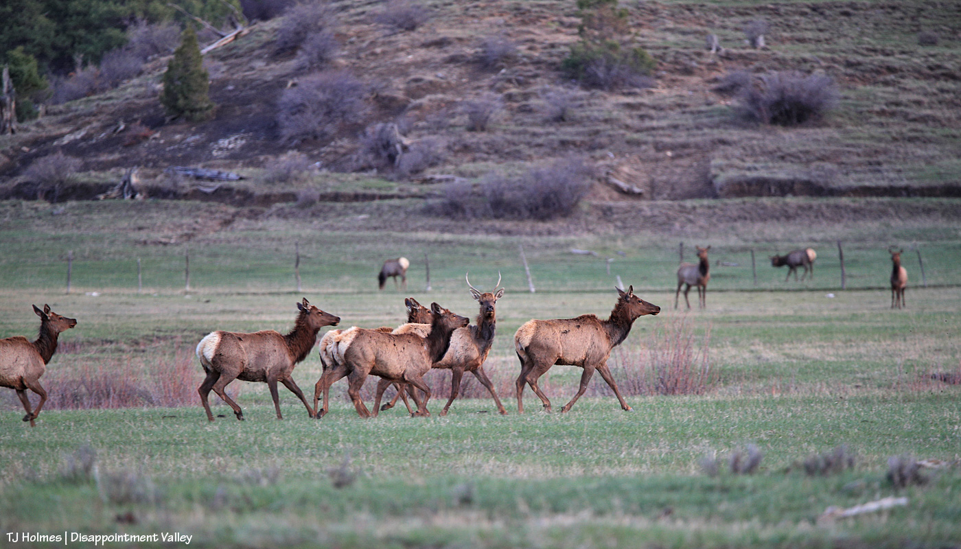 The elk didn’t cross the road to get to the green grass (there was plenty where they’d crossed from) but because the other side of the road features wide-open meadows and more of their friends and family. Almost all I saw in this crowd were cows and youngsters with some young bulls still hanging onto associations with mamas and aunties. There weren’t a huge number of them … fewer than 75, I’d guess.