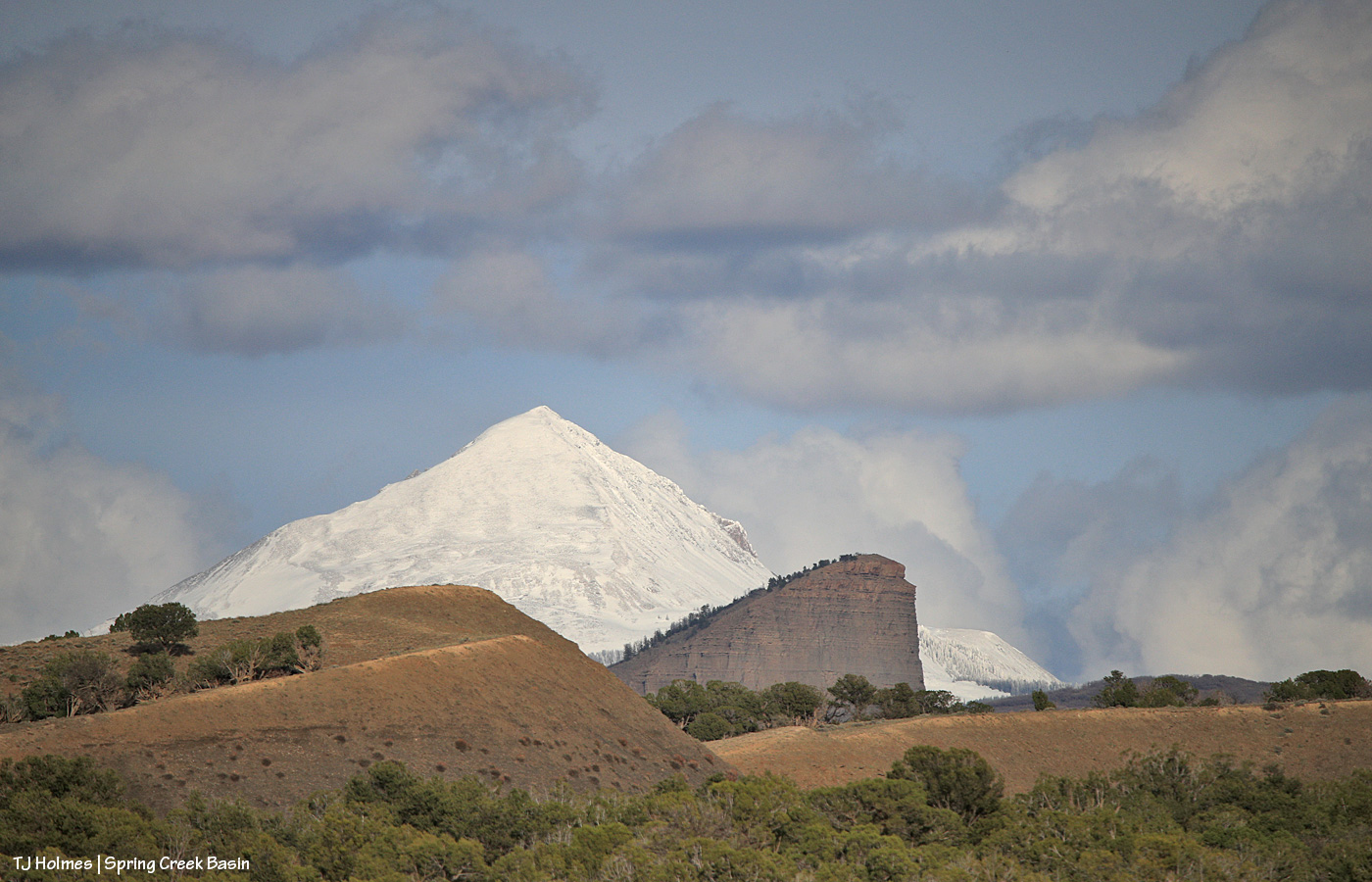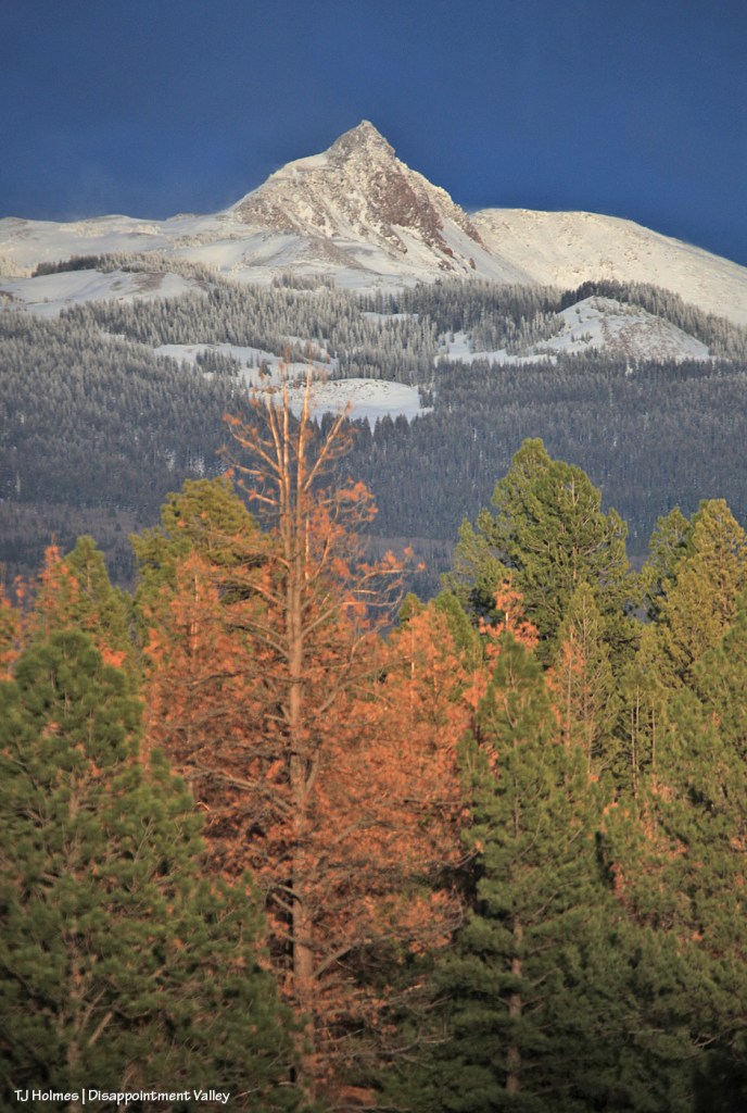 Well, knock me over with a feather! It DID snow … up-valley, not mid- or lower valley (nor did it rain). In the foreground are very newly leafed-out cottonwoods along Disappointment Creek, and in the midground are part of the rimrocks that form the southwestern boundary of Spring Creek Basin. In the background, starting at far right: Flat Top, Round Top and submarine ridge; smack dab in the middle, McKenna Peak; and towering o’er all, Temple Butte.
