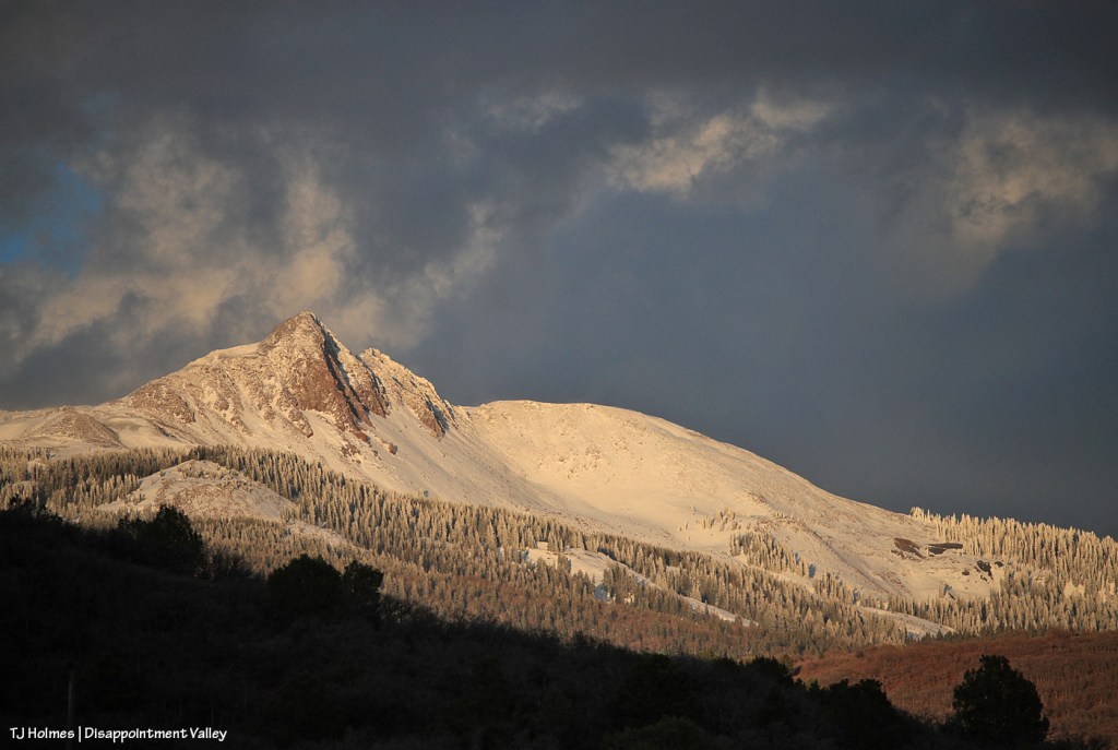 So consider this post part education, part joy at seeing Lone Cone covered in snow (at least for a little while). The words or phrases in blue (and possibly underlined) indicate links to outside sources. It’s going to be a little bit of a long post, too (sorry to bury the lede!), so grab your brew of choice and come along with me β and also, I should tell you now that this spans back-to-back days, an evening (Thursday) and the following morning (Friday). You’ll see why as we follow the snow. π