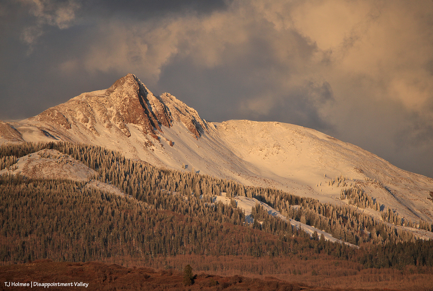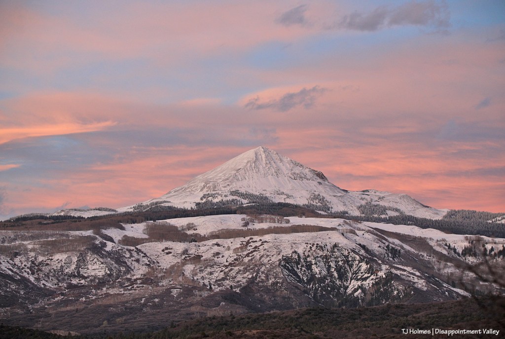 Admit it, you didn’t think it could get better. π When I first was at the upper end of the valley, the clouds were giving Groundhog Mountain the dramatic, bold light and color. This was pretty immediately post-sunset, and the clouds had drifted over to light up the sky above Lone Cone (Groundhog Mountain is farther to the right from this perspective). Um, WOW.