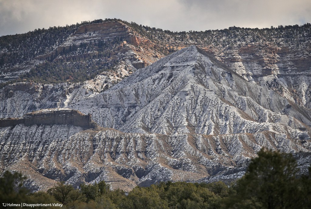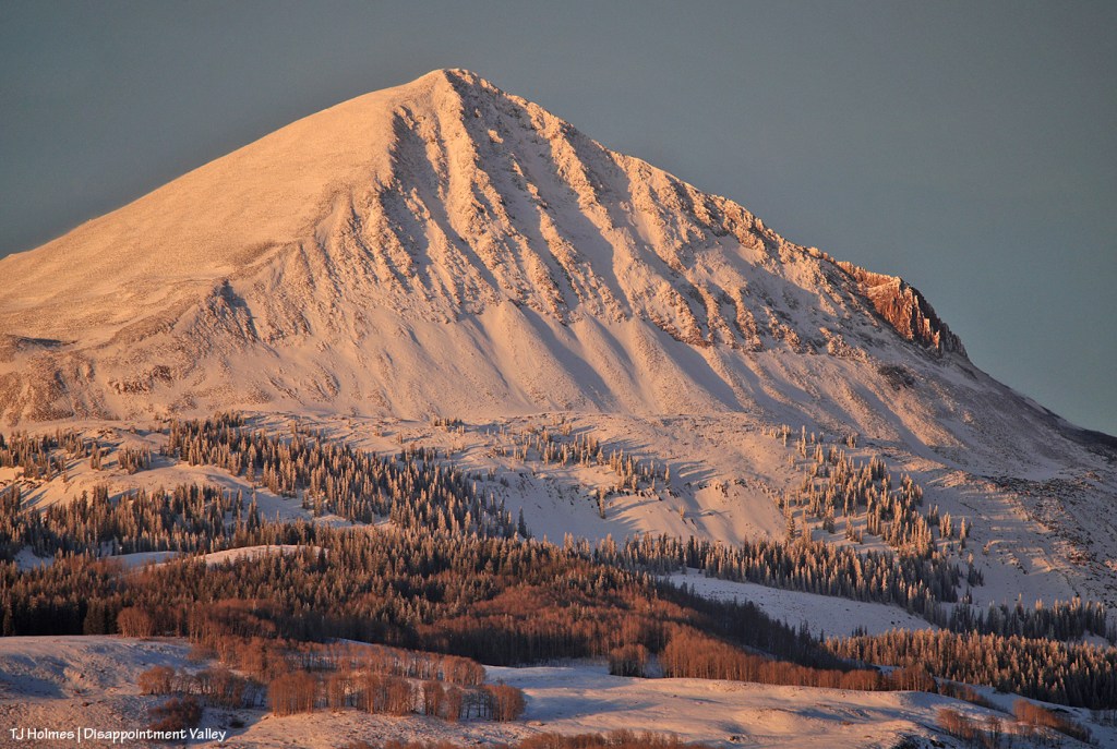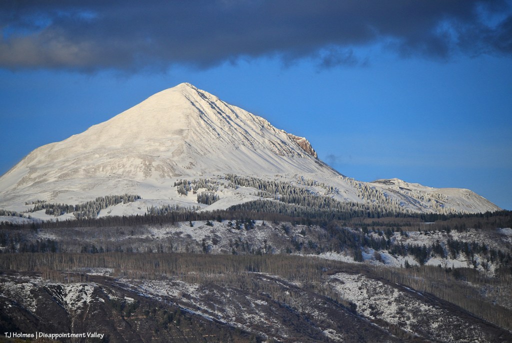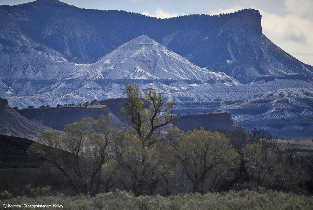 It’s still winter somewhere. π For a little bit longer. Lone Cone snow provides the water that eventually flows down Disappointment Creek, so the more snow, the better. That water doesn’t benefit the mustangs in Spring Creek Basin, but it benefits numerous other species of wildlife from way up high all the way to the canyons of the Dolores River at the far lower end of Disappointment Valley.