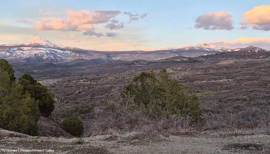 Here we go: A cellphone pic from the “lookout curve” on the switchbacks that lead up and out of Disappointment Valley on the Dolores-Norwood Road (toward Dolores) shows Lone Cone at left and Groundhog Mountain at right at just about last light. I couldn’t have timed that better (the curve was my ultimate destination) if I’d tried (and I did!).