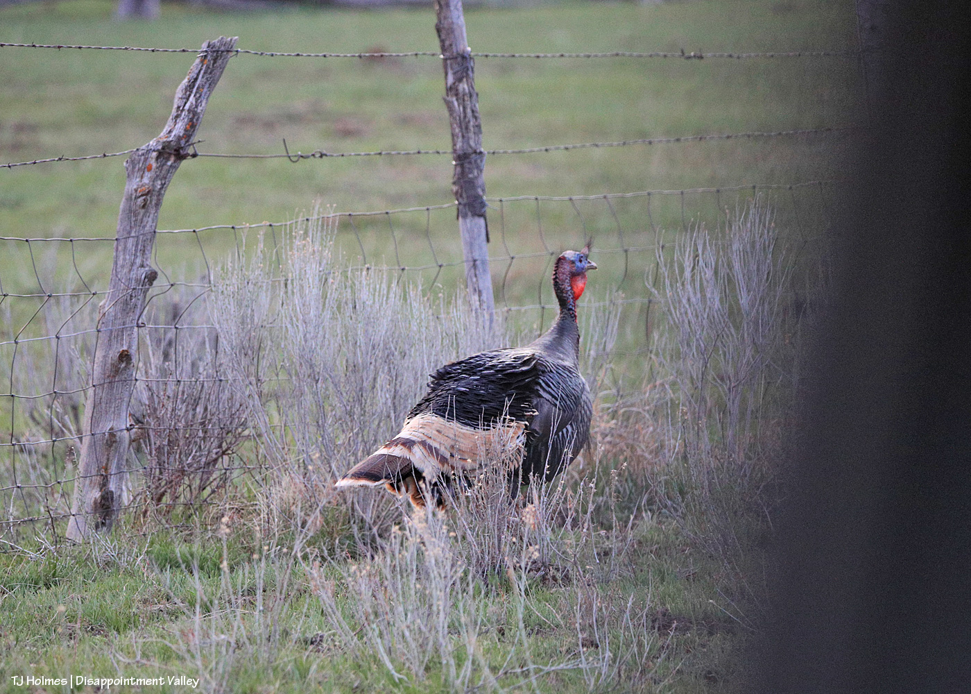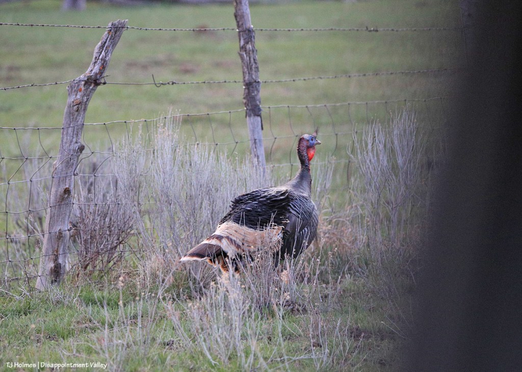 What a contrast, right? The “ugly” head β but those colors! love! β with the absolutely gorgeous feathers. (The darkness at right is the back of my back truck window.) They’re also hard to photograph because they’re faster than you think they should be. This poor guy and another one were “stuck” on the road side of the fence …