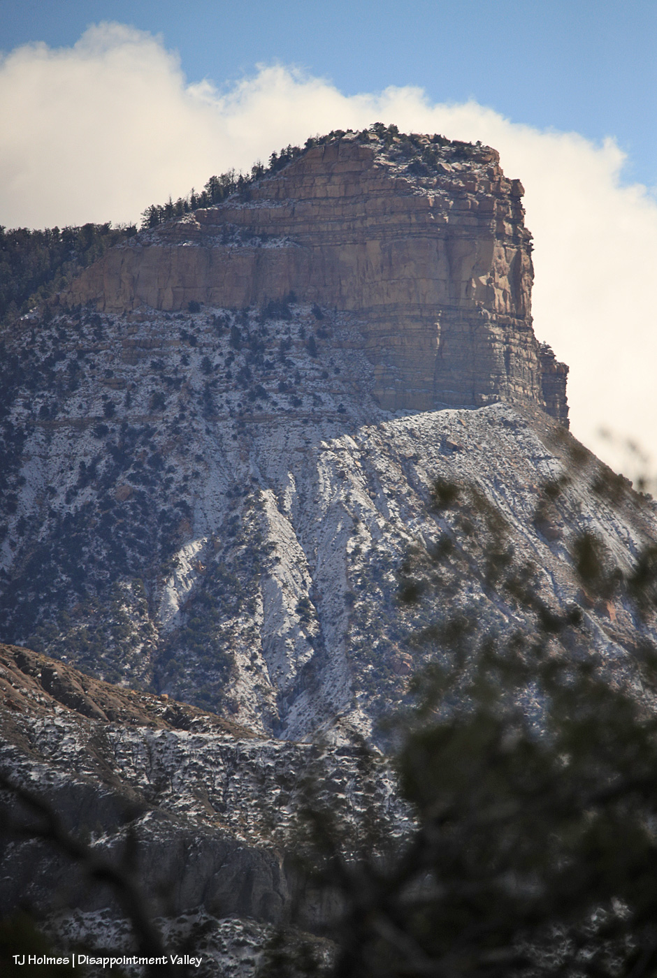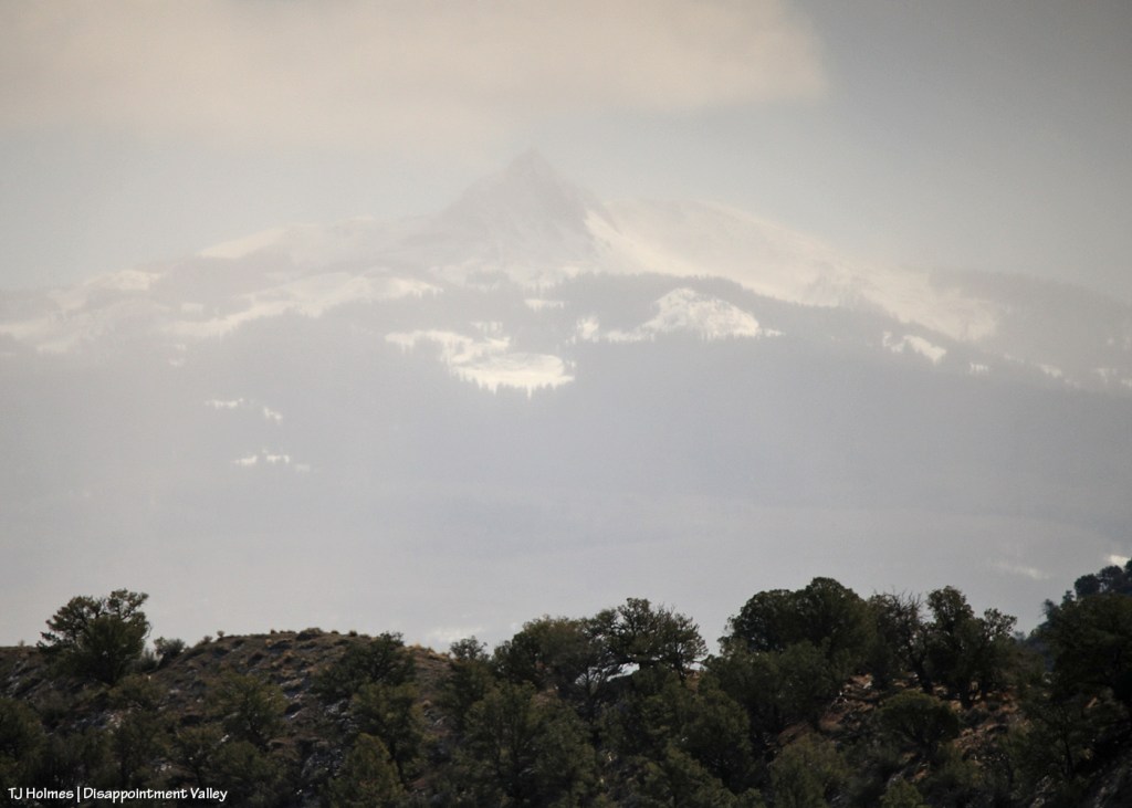 This is where my short trip up-Disappointment-Valley actually started: Seeing snow completely covering nearby Lone Cone from just within the southern part of Spring Creek Basin (not quite as far south/southeast as the mule deer). Except for the very southern area, Lone Cone isn’t visible from most of the basin. (And that promontory in the distance isn’t Temple Butte, which is closer and to my left out of frame.)