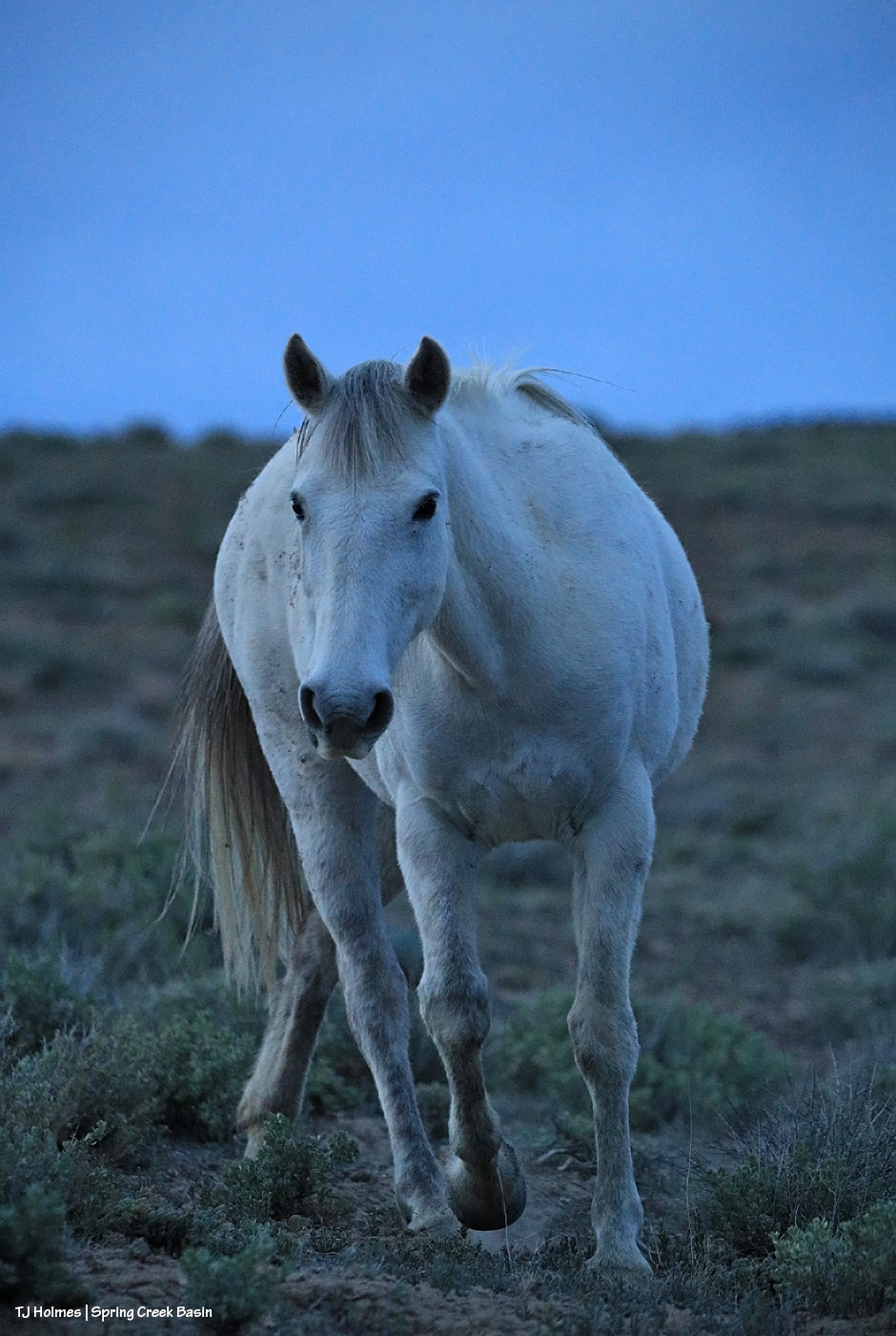 I’m loving these blue-hour images. Seneca this time, performing a little criss-cross as she grazes her way down the hill. This was a little while before I took the pic of the other horses on the nearby ridge in yesterday’s post.