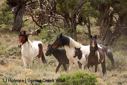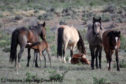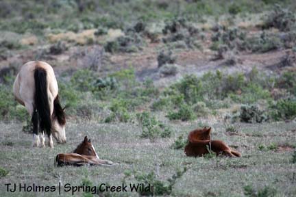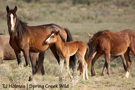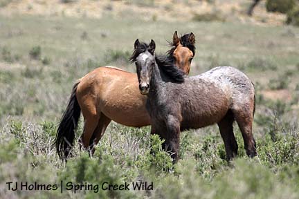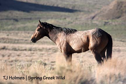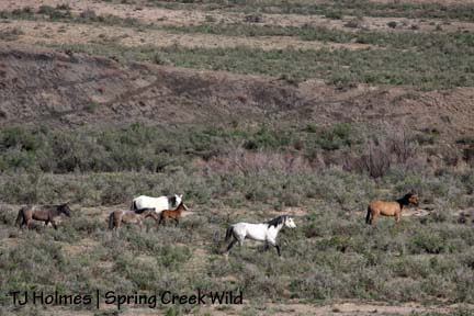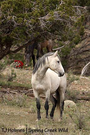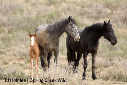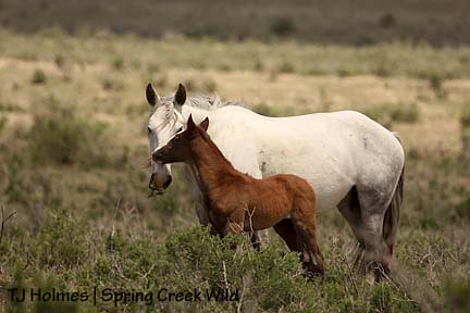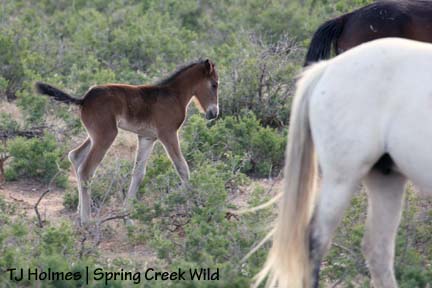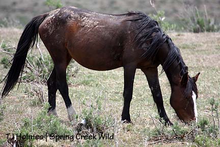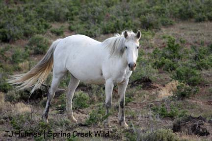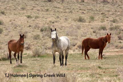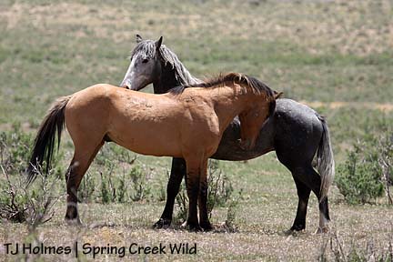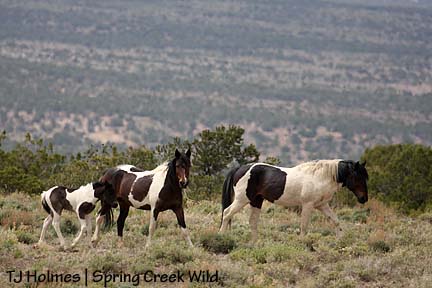 Last year, a bay filly was gathered that had a black splotch – like the splotch on a pinto, except she was otherwise bay. She was sent to Canon City, where she was named Hershey. She was later taken to the Rocky Mountain Horse Expo (held in March, I think) in Denver and adopted. Claude Steelman has a photo of her coming down to the trap site with a grey stallion I think is Seven, her dam and another mare. The splotch isn’t genetic, apparently, but it’s weird to see it show up on another horse, yeah?