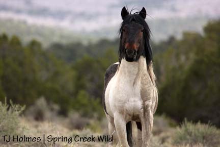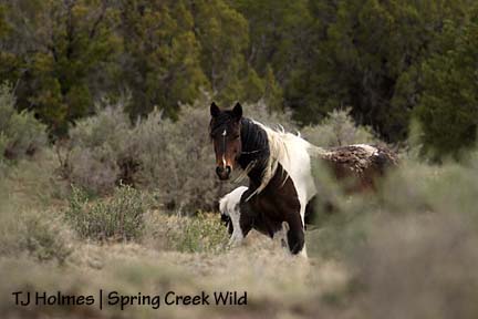 I almost forgot to say that I was planning to stay out there overnight, but temperatures here have plummeted, and it was FREEZING out there last night, especially with the wind, so I wimped out. I did see the bachelor band with the two pintos – Corazon and Cinch – and they were with all the other boys in that group: David, Ty, Mesa and the muley bay (someone please suggest a name for that boy!). I also saw Bounce and Alegre and Gaia – little girl was bouncing around and galloping circles around mama! – as well as Grey/Traveler with his little family: Houdini and Iya, Twister and Two Boots and Jif. When I first saw them, they were spread out, and I thought Grey must have things well under control because he’s not keeping them as tight as he was last weekend. Also saw Seven, Roja and Molly. I just don’t know about Roja’s possible pregnancy status. They were a little distance away, but I had a clear view of them – enough to know there were no foals hiding in the sage nearby.