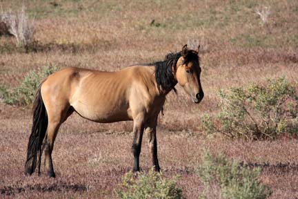I waited until the horses were out of sight and the dust had settled before I drove on. From the road near the double ponds, I spotted Poco and Bones. Then I just caught a glimpse of a red streak – Roach – galloping across the road to the west. After Grey? I never saw his band, and Roach disappeared, so I drove on until I was on a little rise where I thought I’d be able to see to the west – not a soul. I waited, and Roach came galloping back. He stopped just short of the road, looked at me, then galloped back across the road to his own family.
