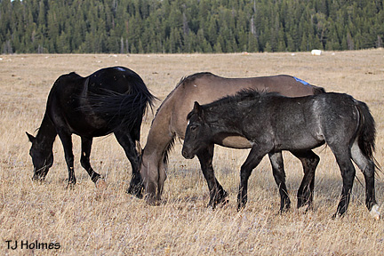 Mahogany grazing; Sable seeking attention from almost-3-year-old Kestrel (yearmate of Shadow and Reya).