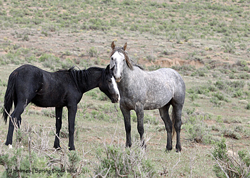 Sable and Hook. They had come down the hill and across the road to the vicinity of Grey/Traveler’s, where I was just walking away after sitting with them. He got all puffed up when he saw them; mama Houdini wisely started leading Terra and Gemma away; Hook wasn’t quite sure what to do about me; Grey wasn’t either, I guess, and finally turned and sauntered after his girls. Though it doesn’t matter in the slightest, I was relieved. Hannah was right behind Sable, grazing with Pinon and Ember, unconcerned.