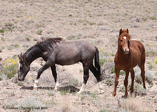 12 06 2010Hannah and Sable, yearling fillies, are with Hook – and their siblings Ember and Pinon. As it gets hotter and that high-desert summer sun beats down on them, many of the horses take refuge under trees. It’s interesting that all these siblings – Sable last – left their mamas (Luna and Mahogany) and rejoined each other as part of a new little band, with former low man Hook as band stallion. He’s doing a good job … even though he seems a little bewildered that they don’t follow him straight away when I come to visit.