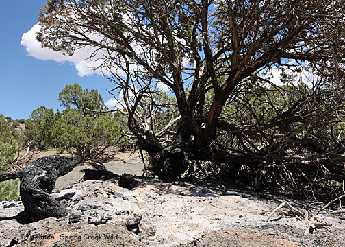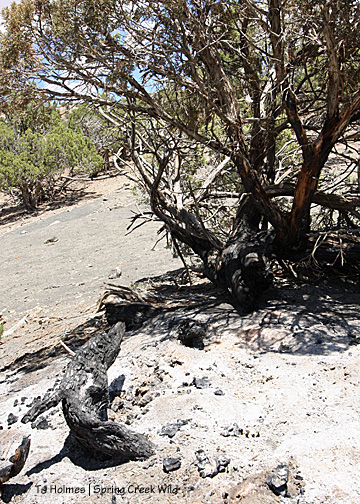 Here’s the “overall” scene. The tree that burned is fringed with brown on its needles – sort of middle/upper right. The dead branch in the foreground at right also burned, as well as the black stump you can barely make out just left of center, as well as some other branches that apparently were consumed by their respective fires. See the little green tree immediately behind the black stump? It’s hard to tell how close it is, but it’s close. That’s pinon – the tree that burned is Utah juniper (I also learned the difference between Rocky Mountain and Utah juniper) – and it wasn’t touched, apparently. But then see what looks like the dead, fallen trunk at far left? It’s attached to those singed needles you see at upper left (against the blue sky). That likely came from the fire, but the tree as a whole should live – even though it looks like it’s on the ground. So did the tree that burned before the fire burned through its horizontal trunk and put the “crown” on the ground, where it fell on another little bush with round little leaves … not a pinon or juniper. I imagine that poor little thing is toast. But hopefully you can also see in this picture, beneath the scattered woodsy debris (I’m surprised it didn’t burn), is grey dirt – which is sort of a mix of dirt and shaley rock – very fine – you can hear it crunch and crackle when you walk over it. And you can maybe get a sense of how far apart the trees are in this area. The FMO did note areas he thinks have burned previously, but grass may never take hold here – not well – because of the poor alkaline soil.