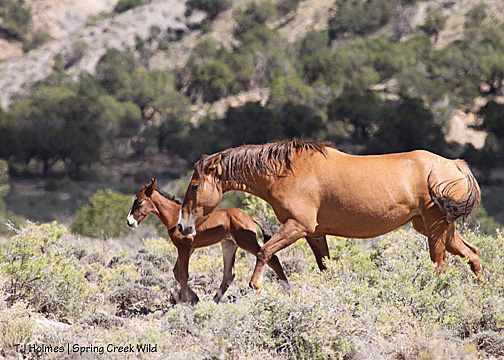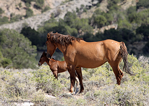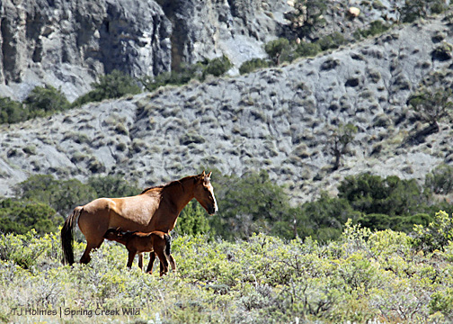 Yes, this is Mona’s first foal – she’s 4 if BLM was right in 2008. None of our duns – Jif or Hollywood or Mona now – have thrown their color. Shane’s mane and tail look black, so I’m pretty sure she’s bay; her legs will darken later. The only buckskin offspring I know of Luna’s is Kestrel, and her first baby is buckskin. From pictures someone else took, I think the grulla mare Slate, who was introduced with Luna in 2001 and died the winter after the 2007 roundup, was Hollywood’s dam. But that grey gene – the BAY gene this year – has proved dominant.