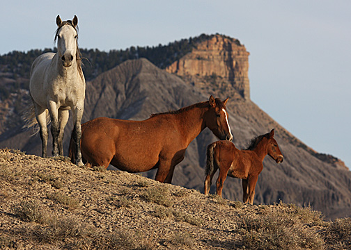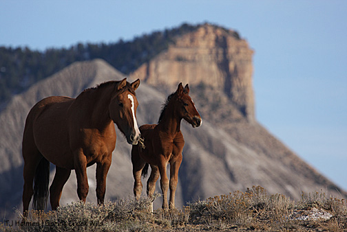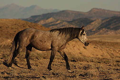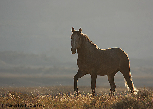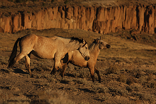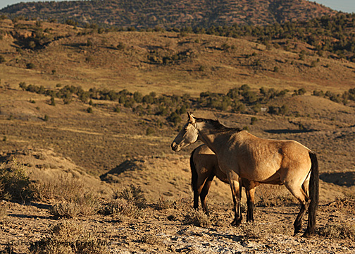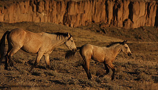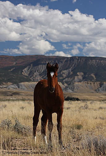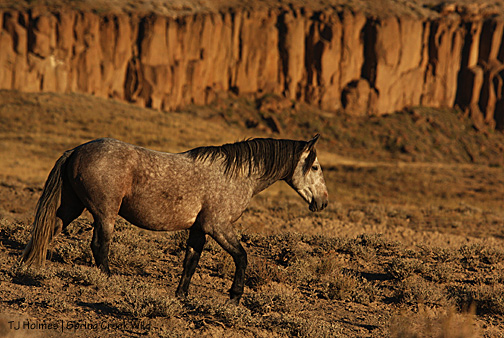 The easily identifiable rimrock above Spring Creek Canyon. And bringing back the “tumbleweed” theme … Last year, I met some folks bringing their cattle down from the high country for winter pasture. The patriarch of the family rides a mustang – a Spring Creek Basin mustang – whose name is Tumbleweed. This man and Tumbleweed were at the adoption in 2007 after the roundup, riding around the fairgrounds as an ambassador for mustangs. Tumbleweed is a big boy – probably16 hands or pushing it – and has the stocky build and tremendous bone that pins him right away as an American mustang. His adopter is quite obviously proud of him. He’s about 7 now, I think, and his adopter said he really started to put on muscle – and grey out – earlier last year. When I saw him at the adoption, I remember him being very dark – like Ty. But what struck me when I saw him last fall was his incredible resemblance to Comanche – in color, certainly, but also in build/conformation and that long-long mustang stride. Just another feel-good story about someone who loves his mustang. 🙂