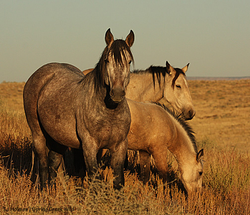 In case anyone else wondered about a comment left recently about Comanche being alone – not to fear. It was a case of mistaken identity and both horses are quite well. Comanche, Kestrel and Winona are still their tight-knit little family, and the last time I saw them, they were close to Steeldust’s band, which really is Luna’s band (!) and her hangers-on. Luna, of course, is Kestrel’s mama and baby ‘Nona’s grandmama!