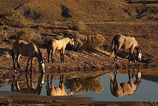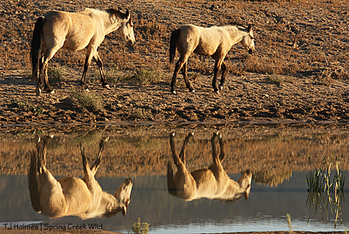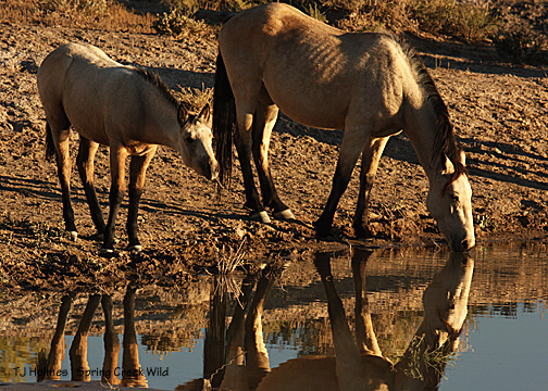 Comanche, meanwhile, drank and drank and drank and drank and drank. Even accounting for the fact that Kestrel started drinking immediately when she reached the water and Comanche first patrolled for stud piles, I bet he drank at least twice as long as she did. I have seen bachelors that hang on at the outskirts of a band – the Bachelor 7, when there were so many of them following Steeldust’s band – NOT drink when the band went to water because by the time the main horses had finished drinking and it was the boys’ turn, the band was leaving … and the boys didn’t want to be left behind? Even in tiny bands like Comanche’s, the stallion is more likely to drink last, and I have noticed that, all things being equal and them feeling like they have the time, they will drink like the proverbial camel while they have the opportunity. A holdover from bachelor-day habits? Mama is producing the milk … why doesn’t she drink so very long? Just something else to wonder about. 🙂