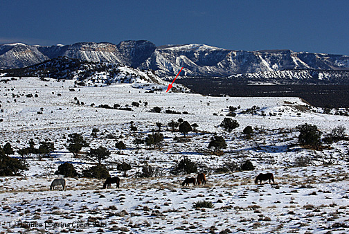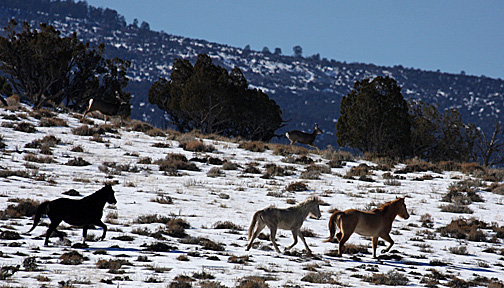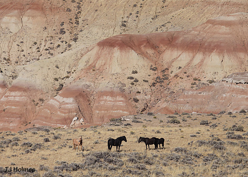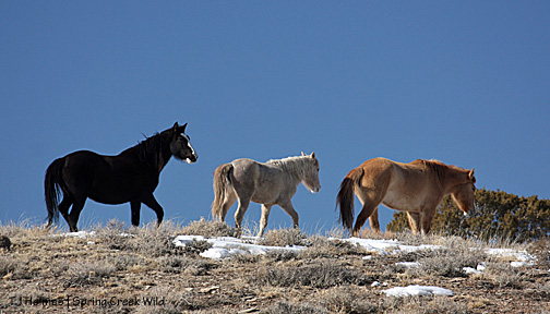 Mouse at left, Mahogany facing and Sundance behind her. Aspen, the third stallion, is definitely the low-rank stallion; he was just up the hill.