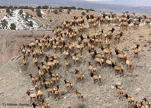Nice looking herd, but I get bored with the repetition of elk butts. I much prefer the variety of wild horse colorations. There was a report in today’s paper that there’ll be prime elk hunting in Colorado this year. There are currently about 300,000 elk across the state. A few simple calculations show that, unless their new promotional campaign is wildly successful, there may be as many as 370,000 next year. YIKES!!!