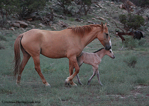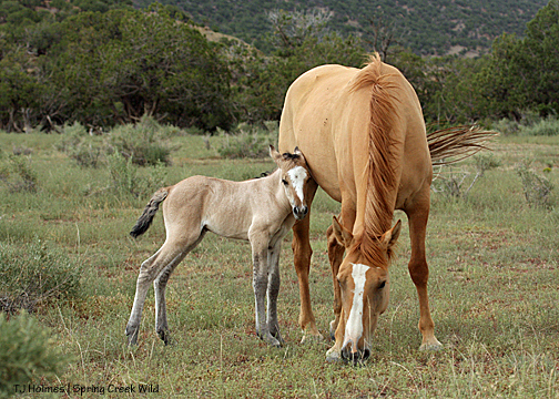 Kiowa and her baby girl, Hacho. Kiowa has been prolific and protective. All of her offspring since 2007 (at least) have survived. She and Reya were released after the 2007 roundup (with Chipeta). Until this year, all her babies were still with her. Spook, 3, is now with Cinch (after being with Bruiser for a while), and Milagro, 2, is with the bachelor boys. (Referring to a recent comment on another post, you can see Kiowa’s “DC” brand clearly here. It designates that she was given the PZP-22 at our August 2007 roundup. It did not work on her other than – possibly – to delay her foaling from May 2008 to July 2009 … then June 2010 and May 2011.)