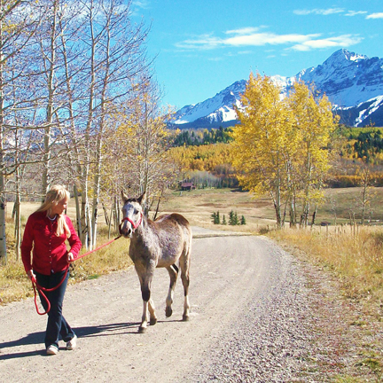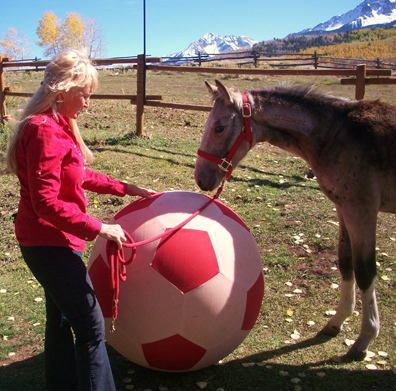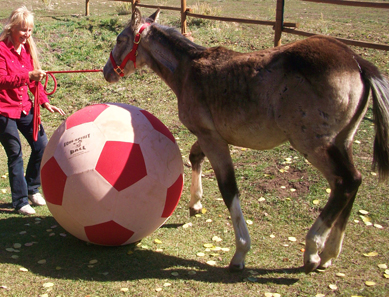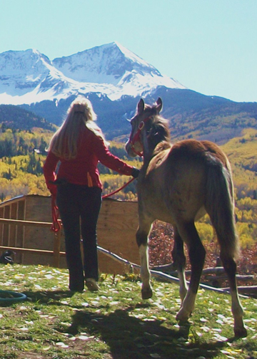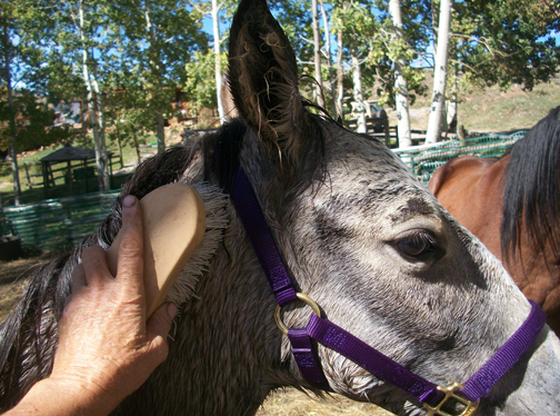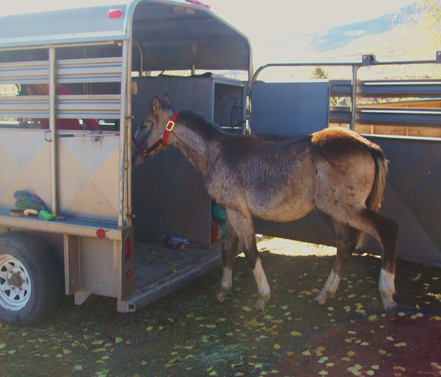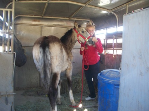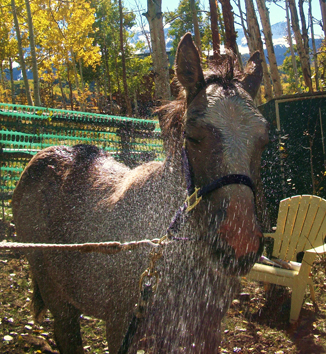 In her words: “As for the horses that have made their way into new homes, it sounds like there ARE a lot of happy ponies & people. We are definitely one of those happy families. Here are some pics of Varoujan (Banjo). He is really doing well. In these pics, you can see the things we have been working on, leading, bathing, the big soccer ball, trailer loading, picking up his feet and getting loved all over. He gets his exercise by ‘free following’ us when we go for rides. I was gone for 10 days doing the Tevis Cup 100 mile endurance cup race and so really didn’t start a consistent training regimen till I got back, and Geeze Louise, he was ‘doing it all’ in 48 hours. He is very level headed and brave. Not skittish at all and loves to be scratched. It is amazing how much he like the HOSE! Too funny. His color is constantly changing but when he is having his baths, it looks like he is really going to be a dark steel grey color next. All of his nicks and scrapes from the round-up & his initial trailer ride are coming in with a dark coat. He will be the ‘mystery horse’ for what his FINAL color will be. I will keep you updated on his progress.”