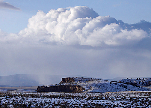 Last view of the day, looking in the opposite direction from above – west – snow falling in clouds beyond Spring Creek Canyon.
