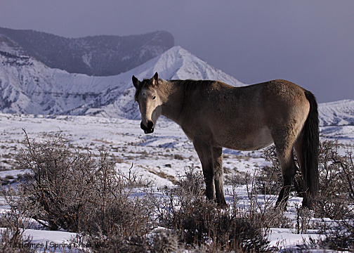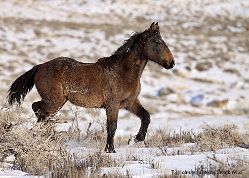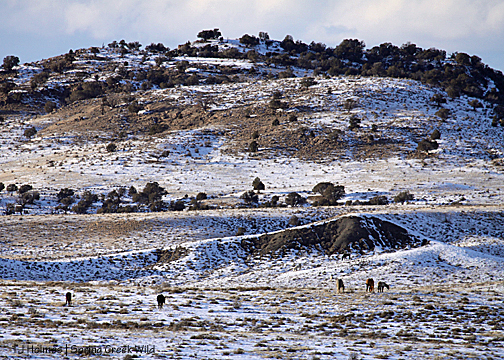 A long view of Sundance’s band (“near”) and Kreacher and Duke. Apollo and Raven are the two dark horses at near left, then Sundance, Kootenai and Mysterium at right. Straight back “above” Sundance is Duke, and just down the slope – left – from Duke is Kreacher; he’s hard to see, grey against snow. The Spring Creek arroyo is between them.