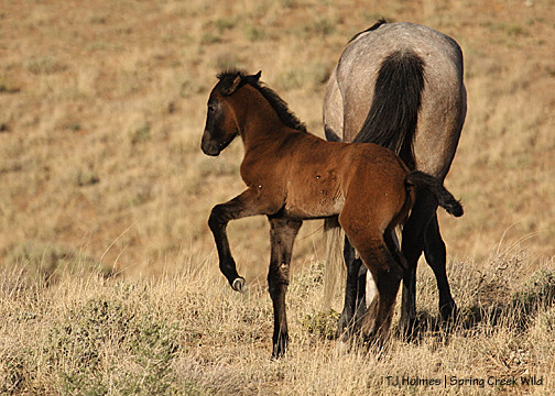 I’m hoping she may be grulla, like her grandma Slate (Hollywood’s dam). And YES, those ARE shoulder bars and leg stripes you see … and she has a dorsal stripe … and can you see the “webbing” on her forehead? Beautiful, beautiful girls!