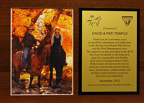 The plaque reads: Presented to David and Pati Temple. Thank you for your many years of unselfish commitment and dedication to the Spring Creek Basin Wild Horses and the Herd Management Area. The support that you have provided to the BLM has been invaluable to the long-term goal of a sustainable and healthy herd area in Disappointment Valley. Without your devotion to the horses, advocacy, hard work and persistence, many maintenance, enhancement and fertility control projects would not have been accomplished. November 2012. Bureau of Land Management Tres Rios Field Office.