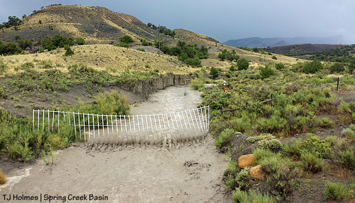 This is the entrance to Spring Creek canyon – site of previous roundups. Spring Creek flows west out of Spring Creek Basin after collecting water from multiple arroyos and drainages in the basin and eventually joins Disappointment Creek, which joins the Dolores River, which joins the Colorado River. Cool, huh? Spring Creek flows only during major rain events like the one today. Spring Creek and Spring Creek Basin are not interchangeable terms.