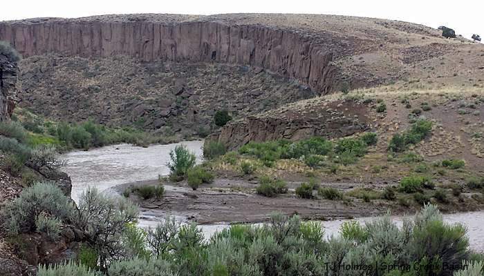 Here’s a shot of the usually-dry Spring Creek arroyo that runs under the Disappointment Road in the northern part of the valley – west of Spring Creek Basin. In the background, you can see the rimrocks that form the basin’s western boundary and beyond, the unnamed promontory. (Yes, that’s dreaded tamarisk along the left bank of the creek.)