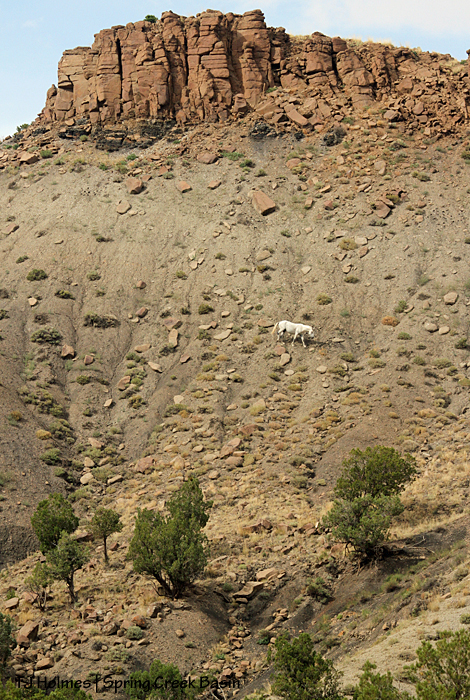 The slope just around the “corner” had good grass. He must have known that or hoped that! Shortly after I took the above pic, he was over there grazing. As often as I see them up in high places – and/or see evidence of them having been in high places – it’s still something of a novelty!