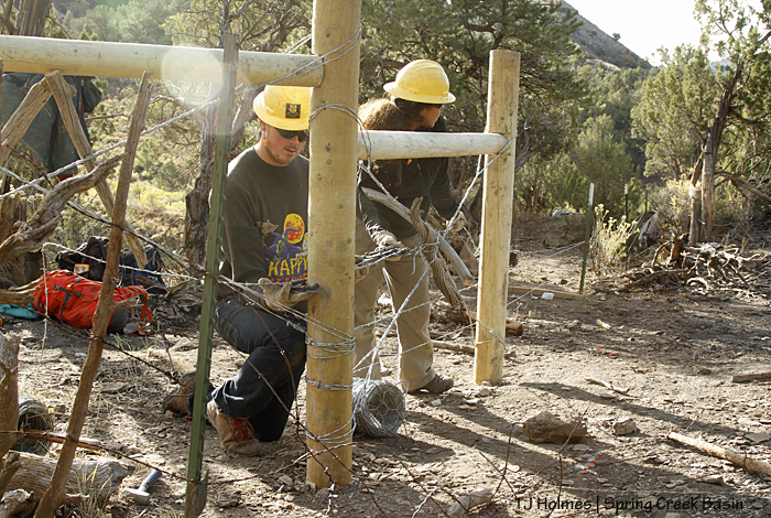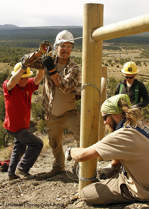 It’s easy to ramble on about the partnerships we enjoy for the benefit of the basin’s mustangs, but here it is in living color: Dillon lends weight to Eric’s drill while he drills a hole in the H-brace into which he’ll later pound a spike. Ain’t it grand?! 🙂 Wrapping wires to create the “X” to further bind the brace posts together are Aaron and Sarah.