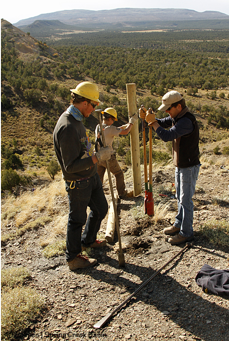 Another view of the same H-brace site, this time with BLM range tech Justin Hunt helping to dig the second post hole. How steep is the hill? The H-brace Eric and Aaron are working on is 100 yards or less below this site – and completely out of view of this little knob in the hill.