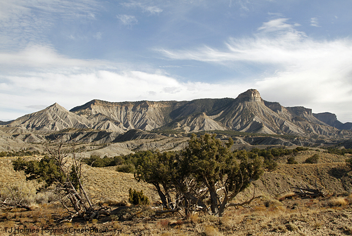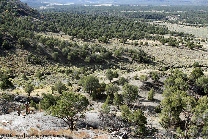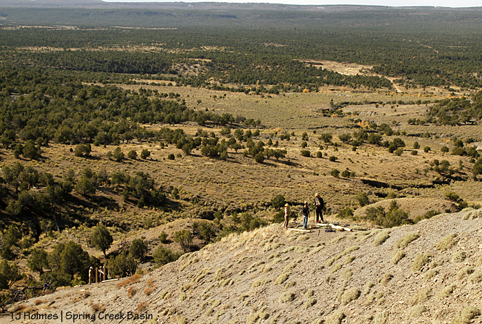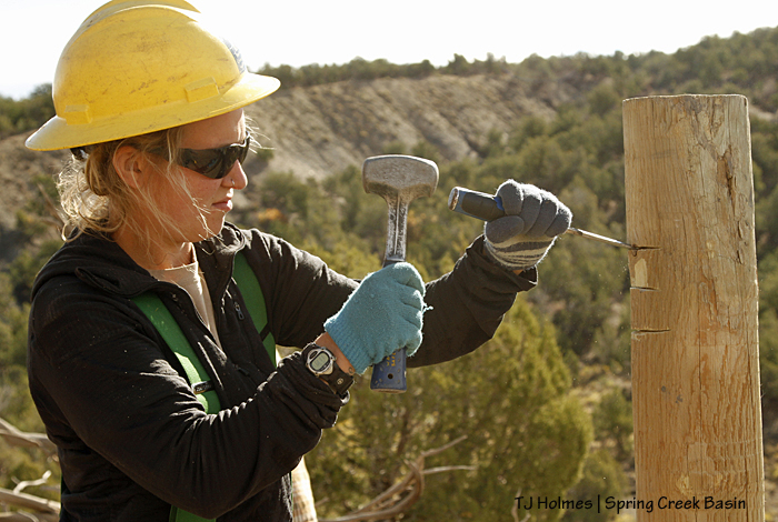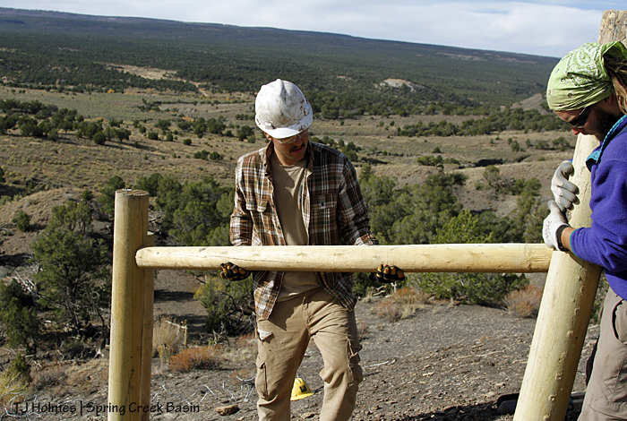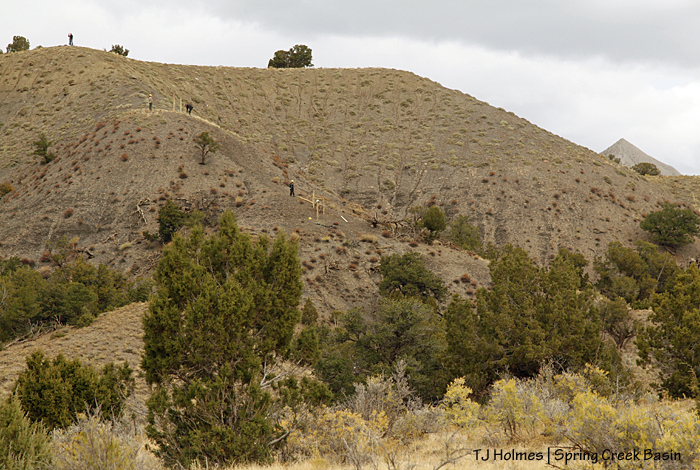 Let’s start with a scenic overview. There we were, on the basin’s far southeastern boundary looking southwestish over the basin’s “last” drainage toward Disappointment Road, the cottonwoods along Disappointment Creek and to more pinon-juniper covered BLM land beyond the basin to San Juan National Forest Service land to the horizon. Note the two groups, both working on H-braces on the near ridge – aka “the steep hill.” If you click to make the photo larger, you may be able to see the silver fence at the left; that’s the part of the fence that the crew already had rebuilt. It runs into the fence rebuilt by Mizzou students (we left a section for the students to work on in the spring).