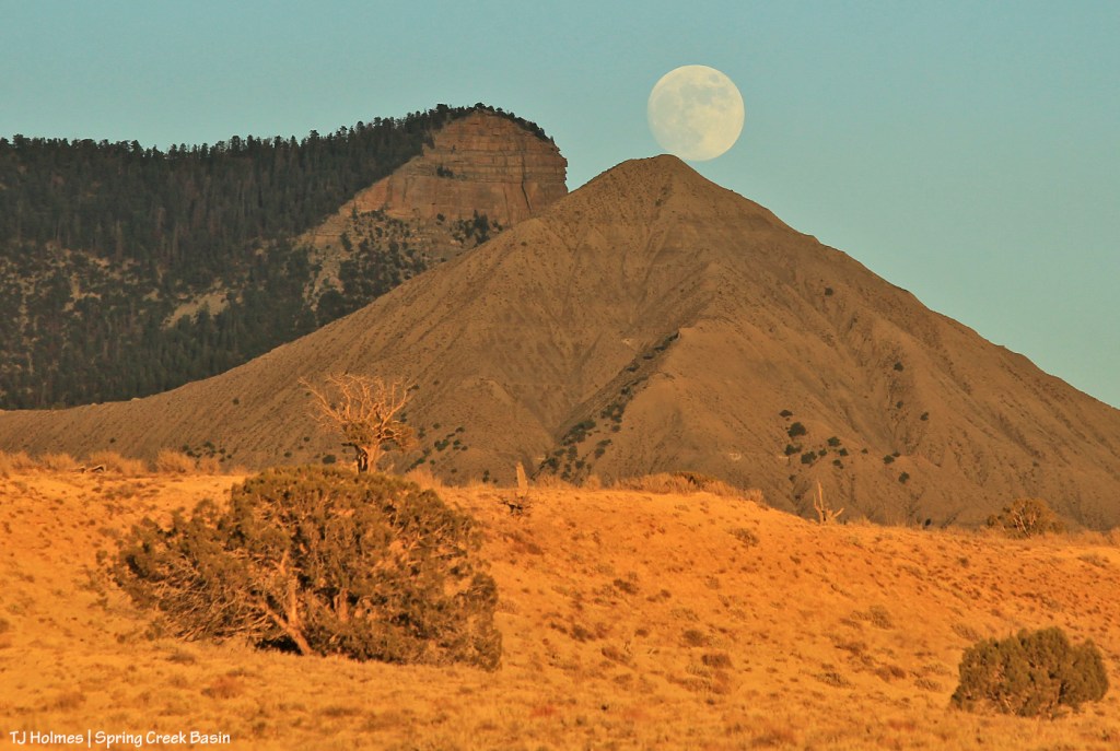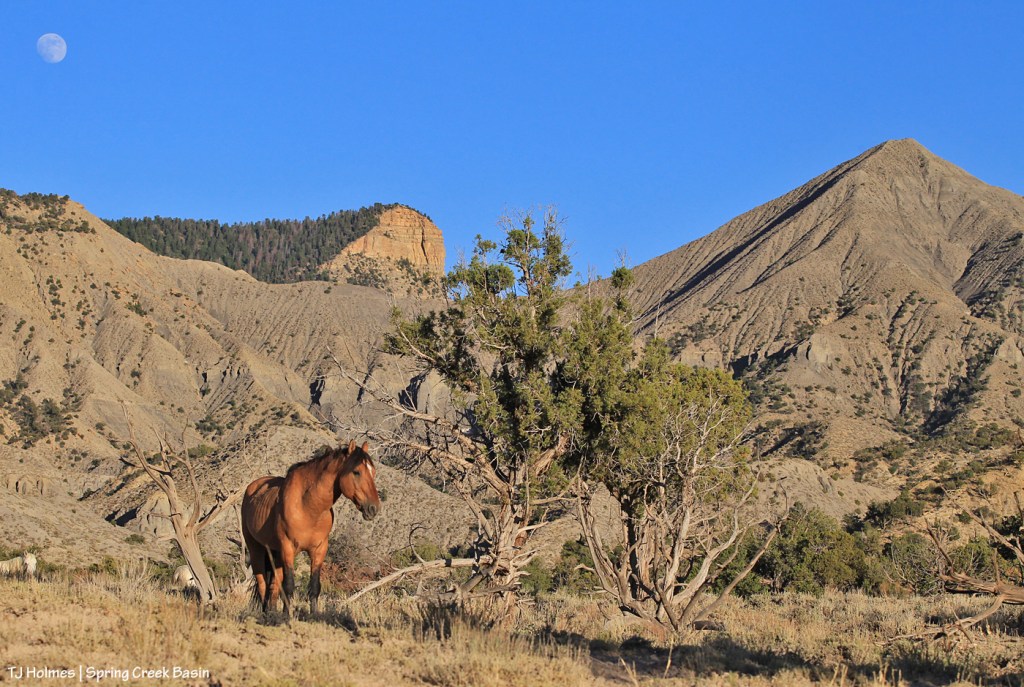Hollywood watches a couple of his mares while another couple peek over the ridge behind him. They chose a pretty scenic place to watch the nearly-full moon rise over Spring Creek Basin.