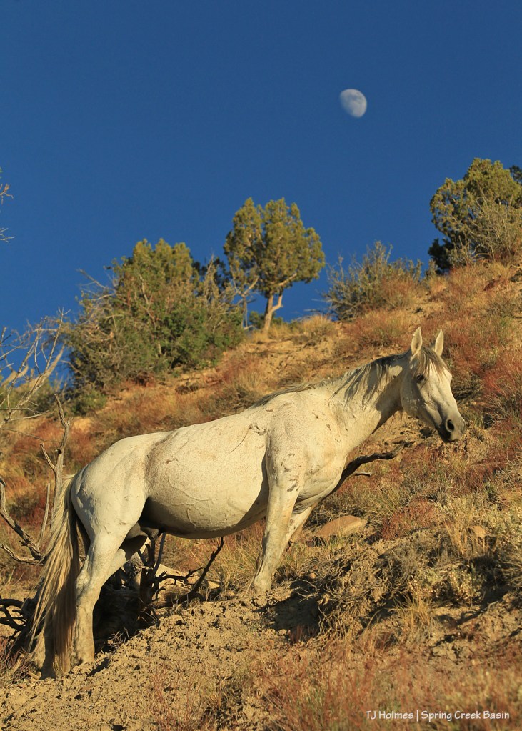 If the angle looks a little odd, it’s because I was shooting nearly straight up at him. He was up the hill, I was down the hill, and the moon already was high in the blue, blue sky.