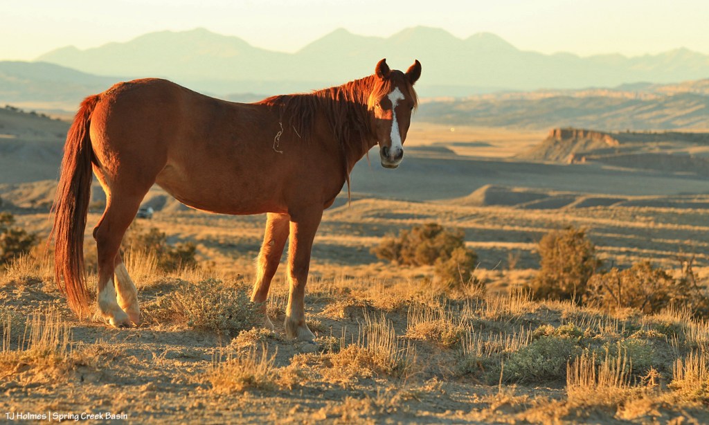 Above, Tesora displays her gorgeousity at the end of a magnificent day in Spring Creek Basin a few days ago, when the air was warm and the ground was dry, dry, dry. But as I didn’t have pix of soaking wet mustangs, I thought she’d have to do. πŸ™‚