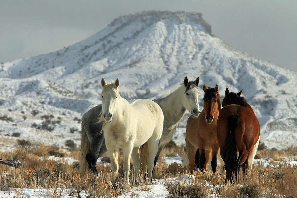 In January, we had fresh snow, and I was happy to find Hollywood’s band in the scenic eastern part of the basin, a short hike from the road (I may even have strapped on my snowshoes). McKenna Peak and Temple Butte are iconic landmarks, and I love to feature them in photos behind/above the horses. Because of the way they were standing, however, Brumley Point, seen here, made the obvious background (the peak and butte are farther to the left). Even though Shane had her rear toward me, the horses were so relaxed, their winter coats so velvety thick and glowing in the low winter sunshine, their demeanor so peaceful, this became one of my favorite images of the day (and month).