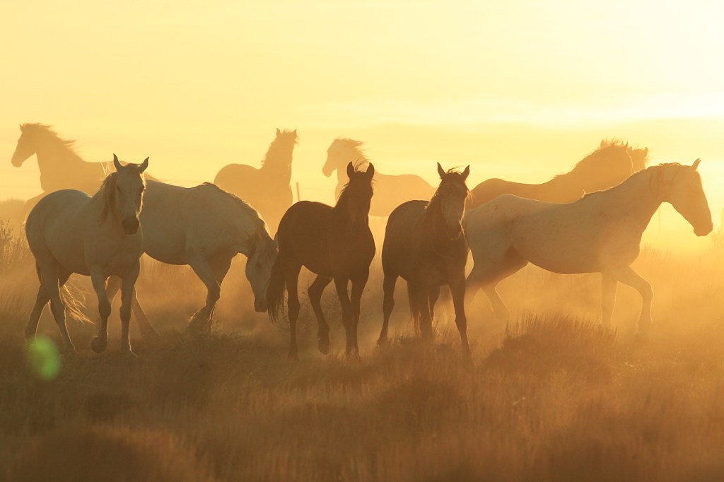 This is an image that happened almost without me being there to see it, let alone capture it on digital media. I was with a couple of bachelors on a hill far, far (enough) away, thinking they were my last quiet visit of the evening. But one of the bachelors was interested in something besides me (ah, the story of my single life!), and as he focused on *it*, I heard a sudden, sharp whinny in the distance. One whinny, three bands – plus a bachelor after my guy trotted out to meet them. I had to hustle back to the Jeep and drive closer, and then hurry out to them as the sun was sinking (neither planetary roll nor mustang waits for the photographer to get her act together – or close the gap in distance). And although it was terribly dry in June (as it had been and would be), it’s not often (almost never) that enough horses are together – and moving enough – to cause enough dust to rise for a shot like this to even be possible in the basin. So, even from drought, something beautiful.