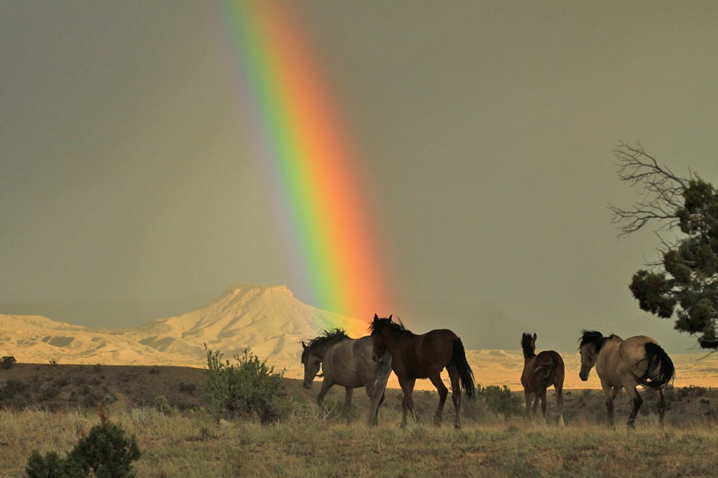 This – THIS! – was one of those astounding moments when you literally are in the most best place at the very most bestest time, and you cannot believe your luck and goodness and that karma is smiling on you. … And then the horses won’t cooperate. 🙂 There was not one but TWO utterly spectacular rainbows against a sky promising even more rain (the second arch was out of the frame to the right). It was windy, and the horses were edgy. There were (and are) a couple of bachelors with the band, and that energy, combined with the storm, meant that they really weren’t in the mood to line up with ears up showing perfect conformation stances against the wild wonder of Spring Creek Basin and a rare rainfall. … So I “caught” them as they were walking on, and it was enough to remember the day and their wildness and their freedom to move under the magic.