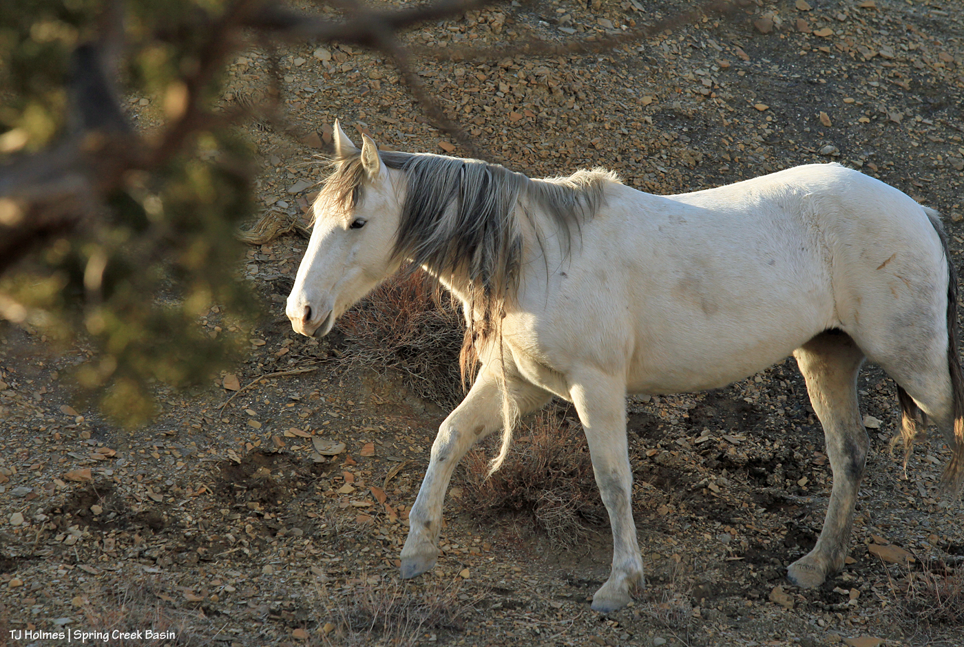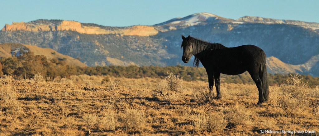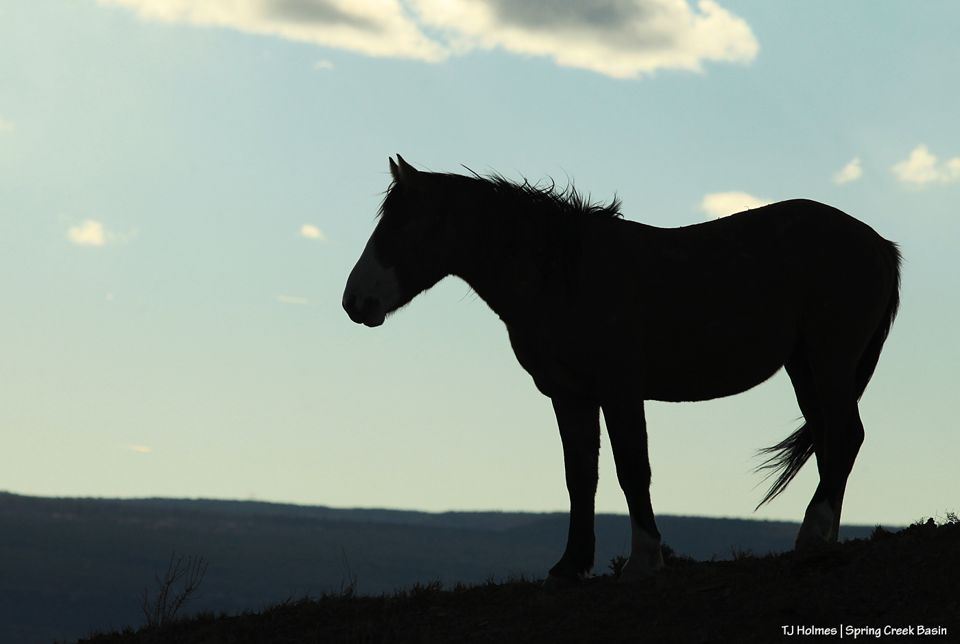 When Hayden reappeared, having ensured that the rival band was no threat to his family, he approached the arroyo, then stopped (he even cocked a hip!). Apparently, it was a standoff; would he make the effort to traverse the deep ditch again … or would his mares make the effort to join him on the other side?