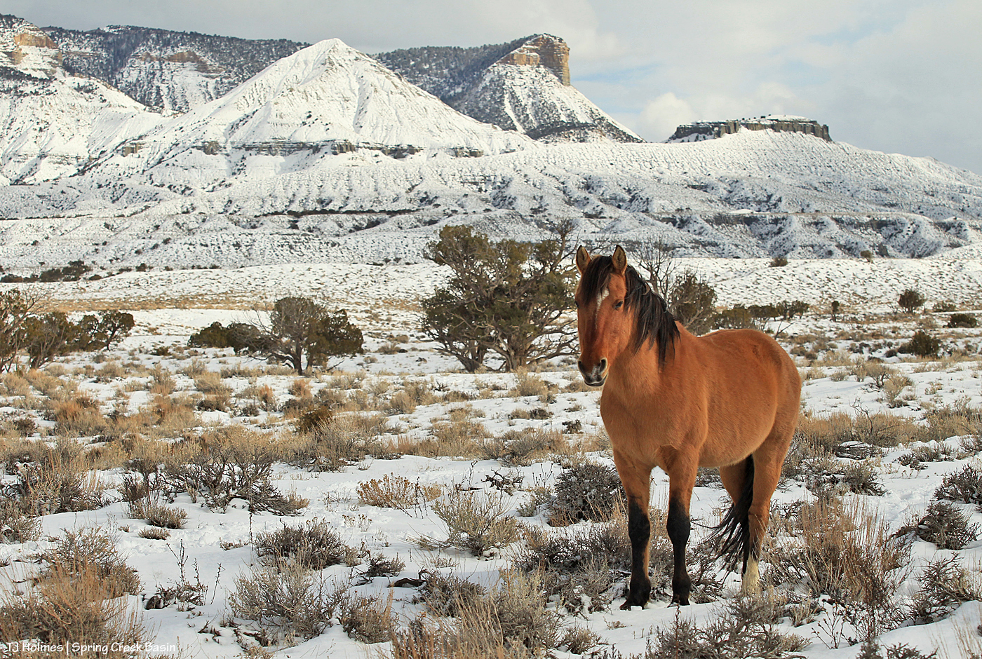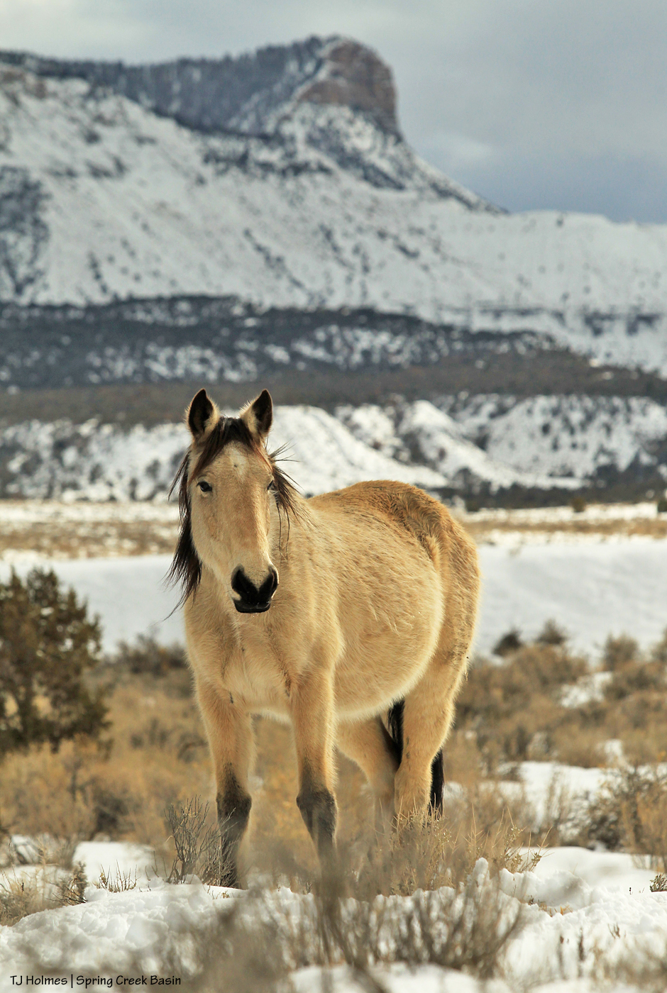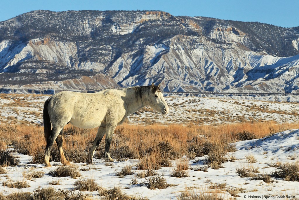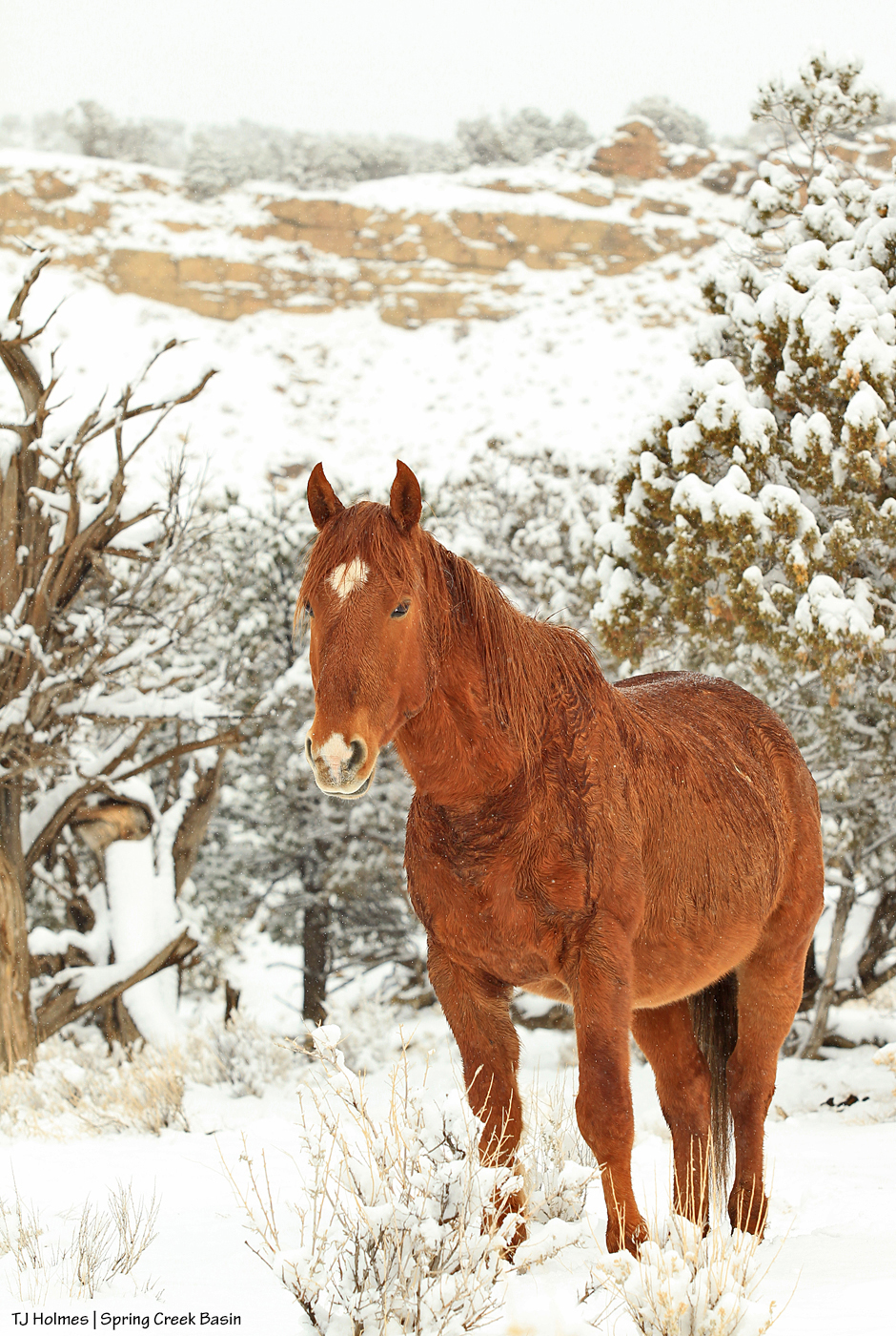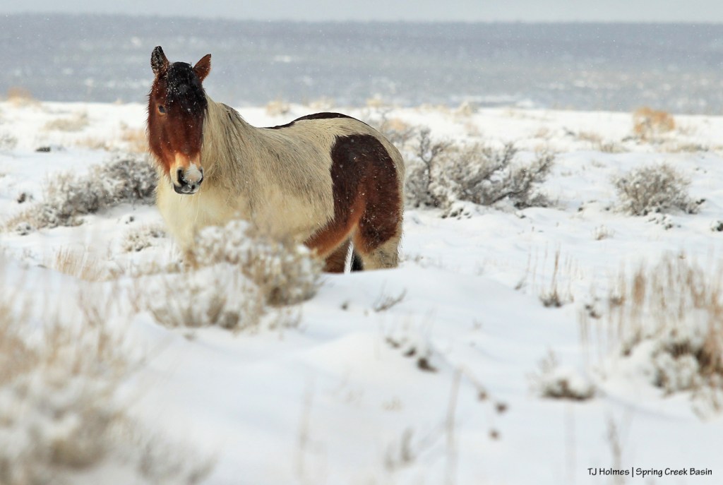 At the very end of the day, sunlight reached far enough across the basin to highlight the horses I was visiting … and not quite as far as the far hills, where the snow still fell.