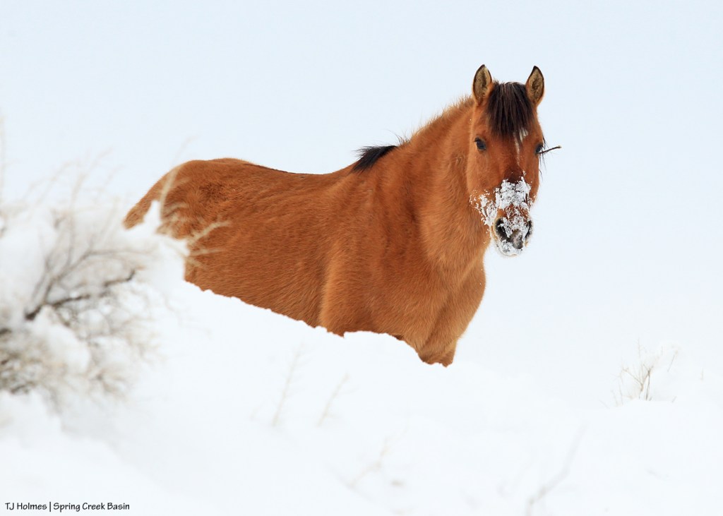 This pic of Madison, happily slurping a mouthful of snow, was taken about 10 days ago. We just got another healthy dose of rain and some blowing snow … on top of the MUD that is the WORD of the moment right now in Spring Creek Basin. 🙂 My frustration at lack of visitation can’t quite compete with my joy about the moisture.