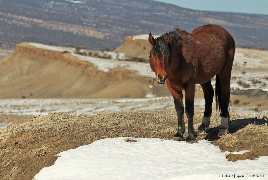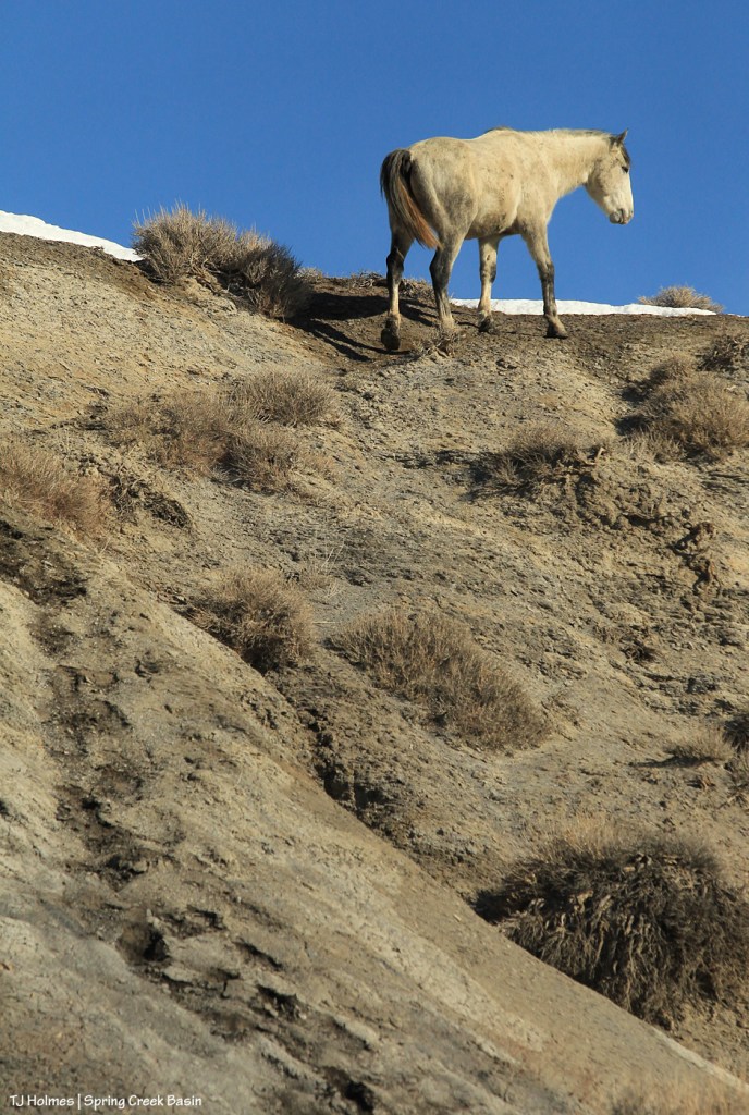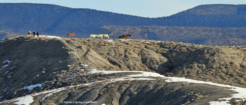 Two bands separate on top of what I call bachelor ridge after browsing through snow at the base of the ridge. Although I was fairly far away, I loved the way the horses seemed to glow against the far ridges. Snow on south-facing slopes is always the first to melt. Later in the morning, the ground became pretty soft. 🙂
