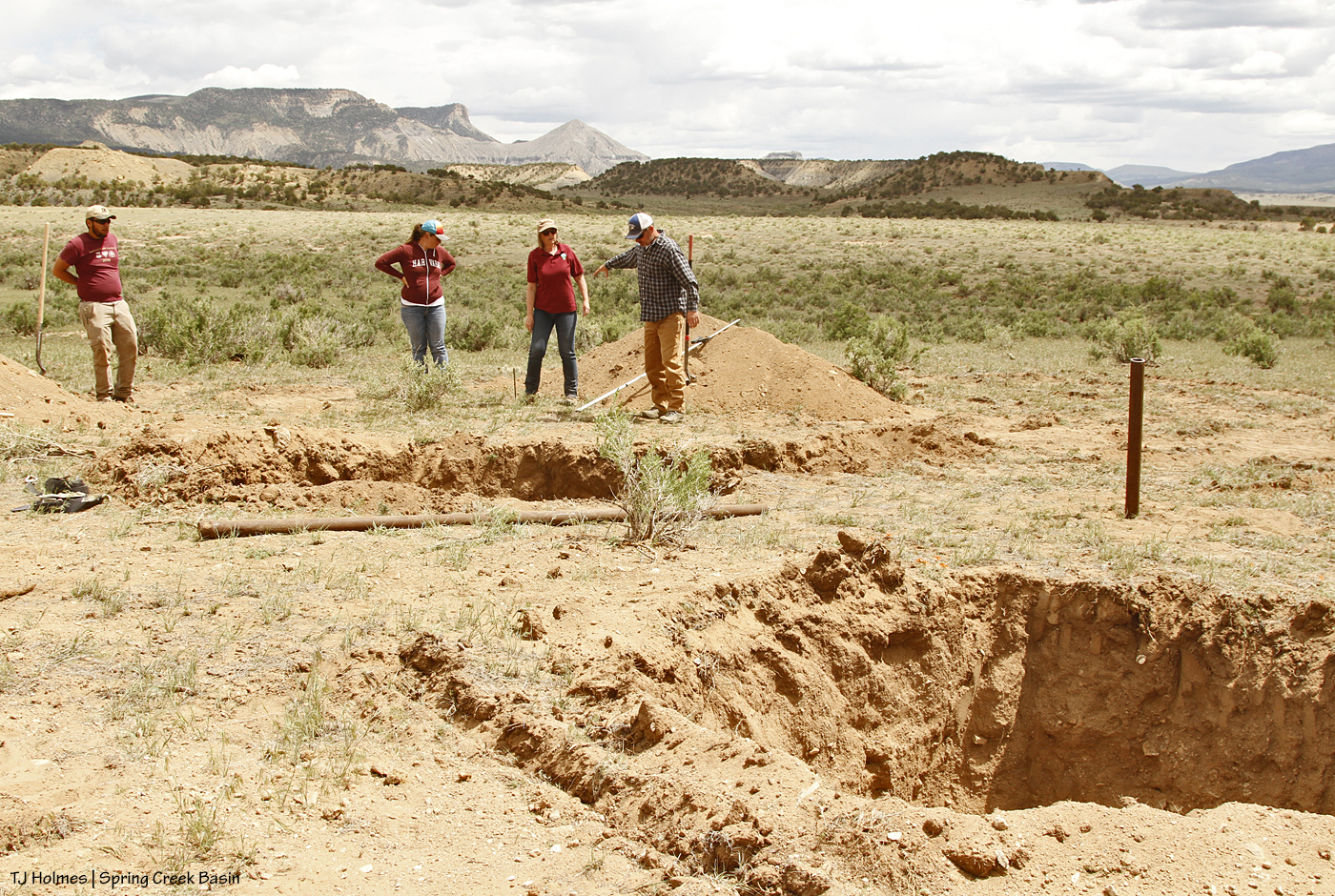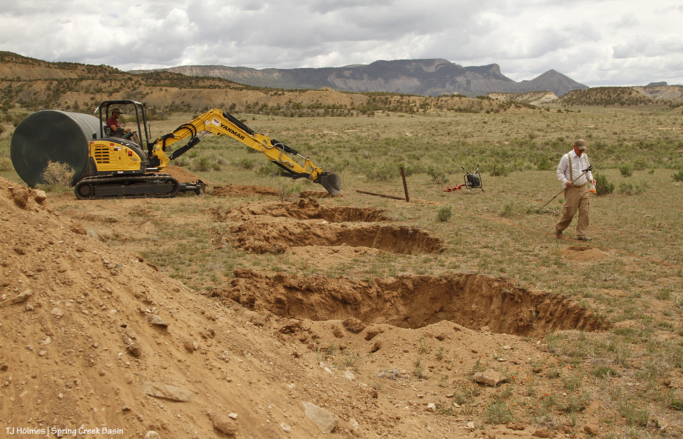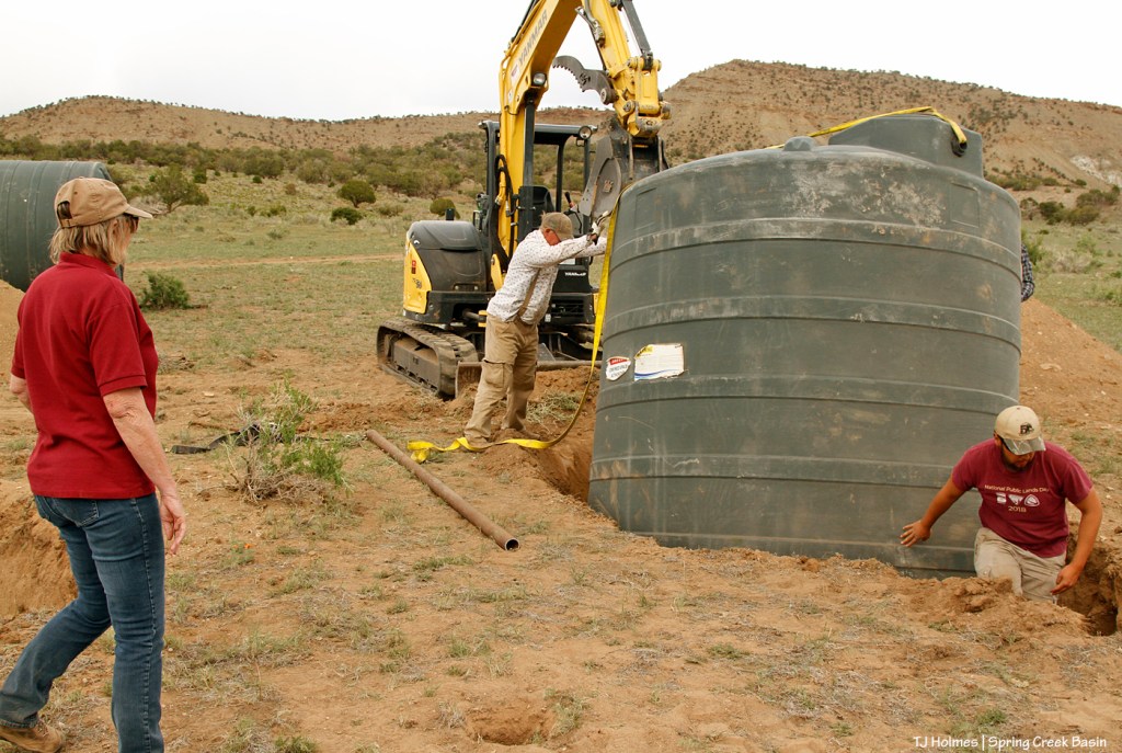 In the afternoon, Mike arrived with Tres Rios Field Office Manager Connie Clementson and BLM employee Whitney Carnahan (I knew her when she was a seasonal and don’t know her married name) to show off and explain the project. Daniel and Jim were just about to use the excavator to pick up the first water tank and lower it into the first hole.