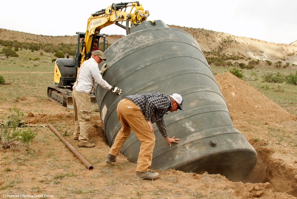 If you missed yesterday’s post, a brief recap: I’m telling the story of the first phase of the building of the first of Spring Creek Basin’s two new water catchments. In this first phase, don’t think building UP so much as digging DOWN (the up-ness will come in phase 2). There were some holes to dig before the pretty stuff – the water tanks – could be placed, and the tanks had to be placed before the moisture-gathering roof can be built.