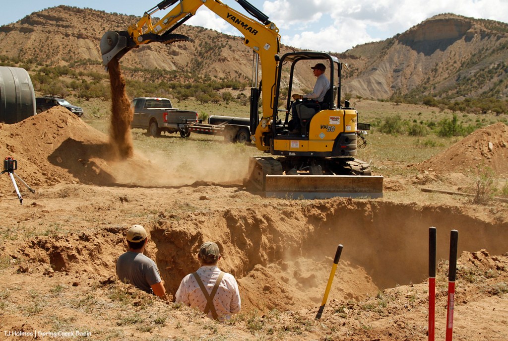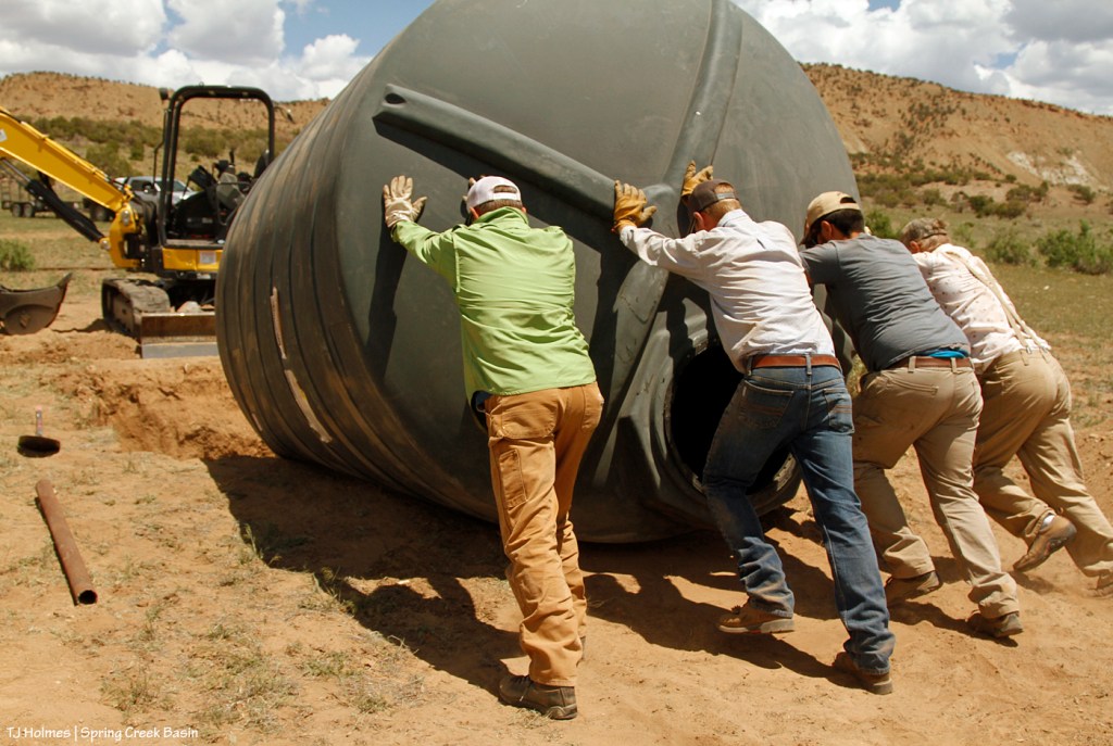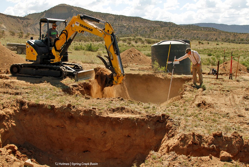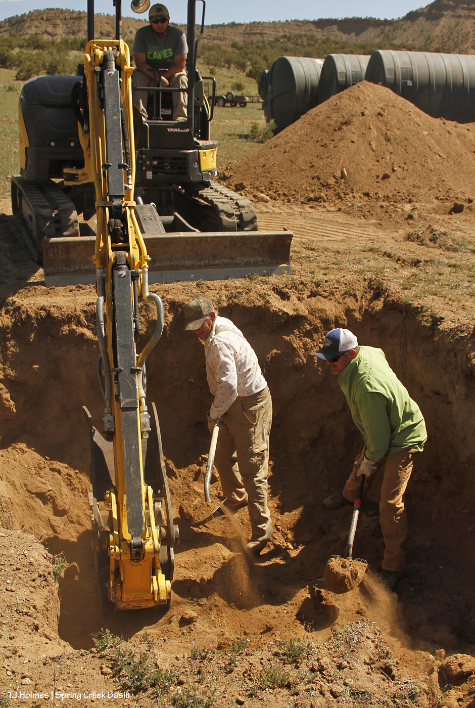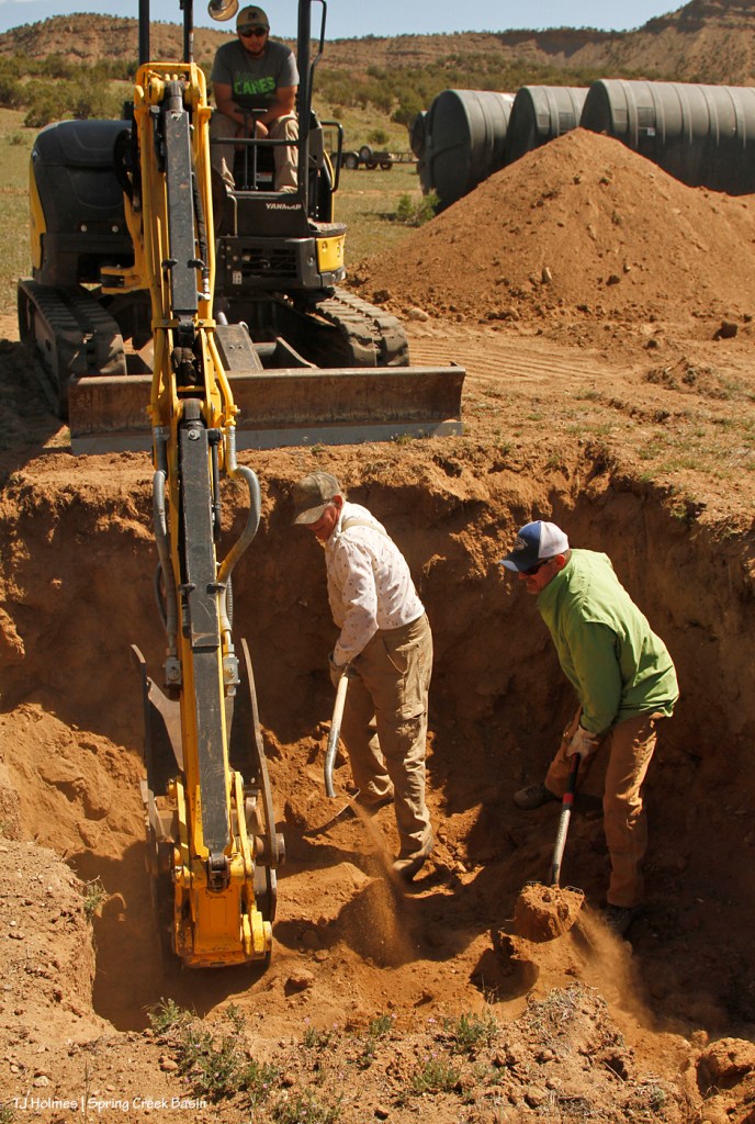 The third day of the water-catchment build story finds us back in Spring Creek Basin with the full team. Daniel used the excavator to widen the holes for the tanks, and the other guys used shoves and rakes to clean out the crumbly bits (into the excavator’s bucket). Then the holes were primed – literally – for the dumping and aligning of the tanks.