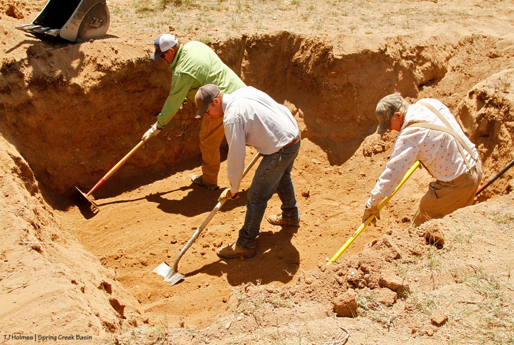 Mike and Jim had to get in the hole to do some finesse digging of the sandy dirt crumblies. By this time, the dirt was approaching the consistency of powder. (I’m not sure whether I’ve ever mentioned on this blog, but it’s dry out there … !)